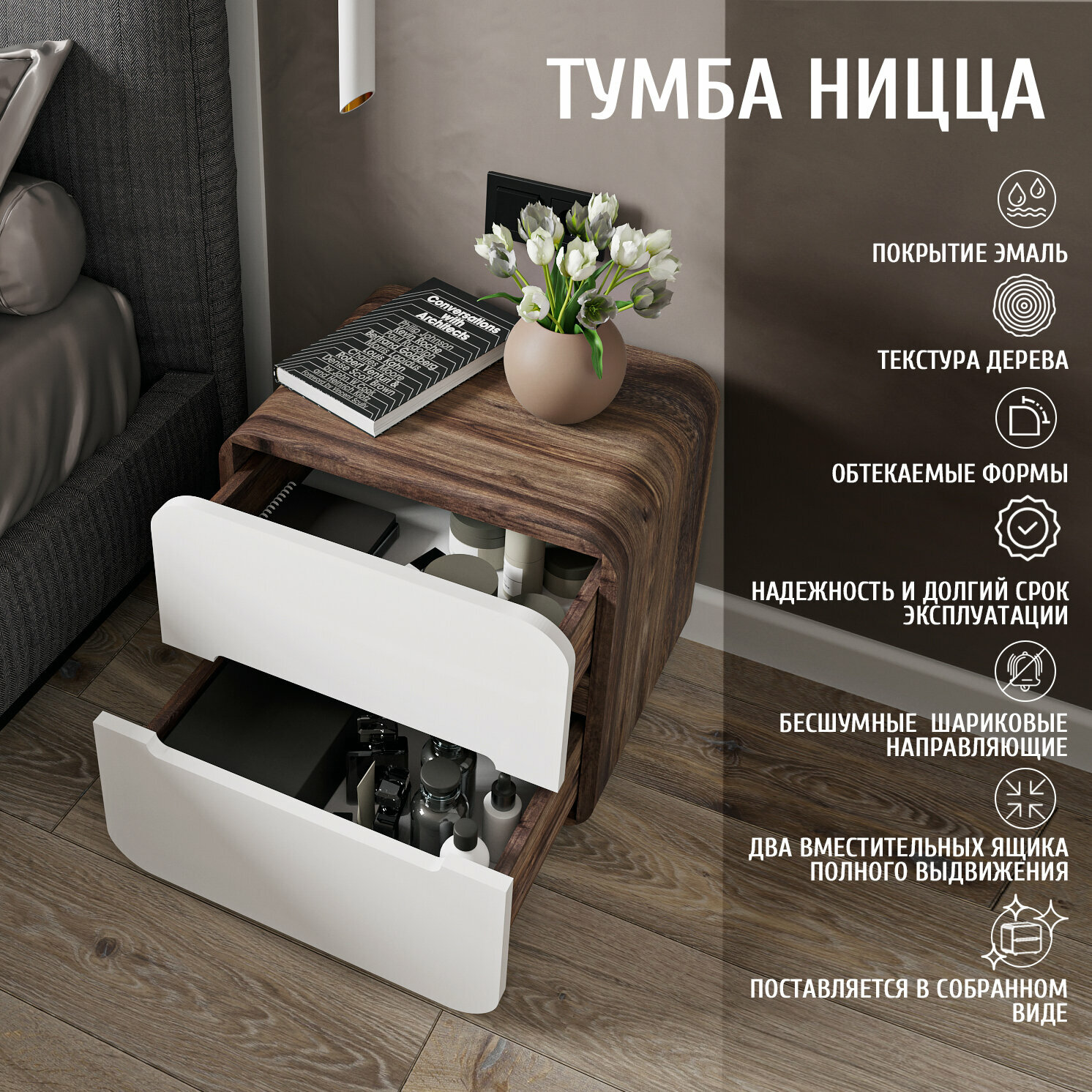 Купить Тумба прикроватная с ящиками Ницца 50, темное дерево-белая