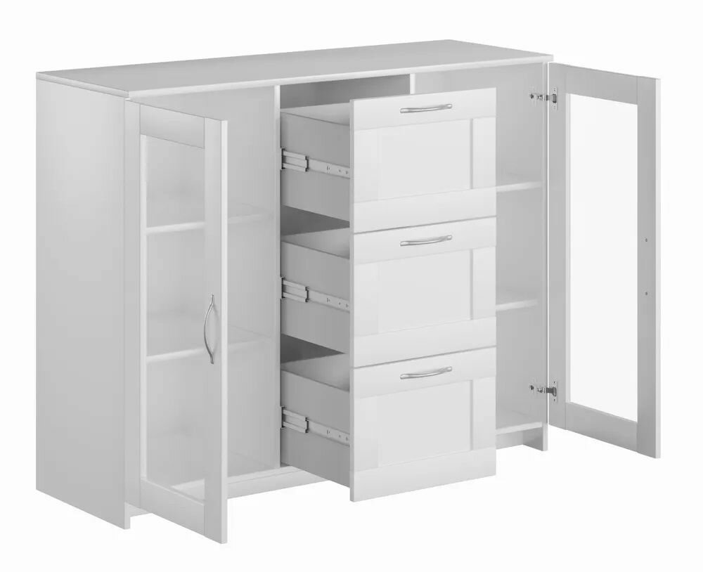 Тумба сириус, 2 двери со стеклом и 3 ящика, 117х41х95 см, белая