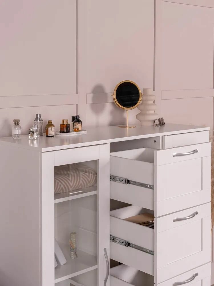 Тумба сириус, 2 двери со стеклом и 3 ящика, 117х41х95 см, белая
