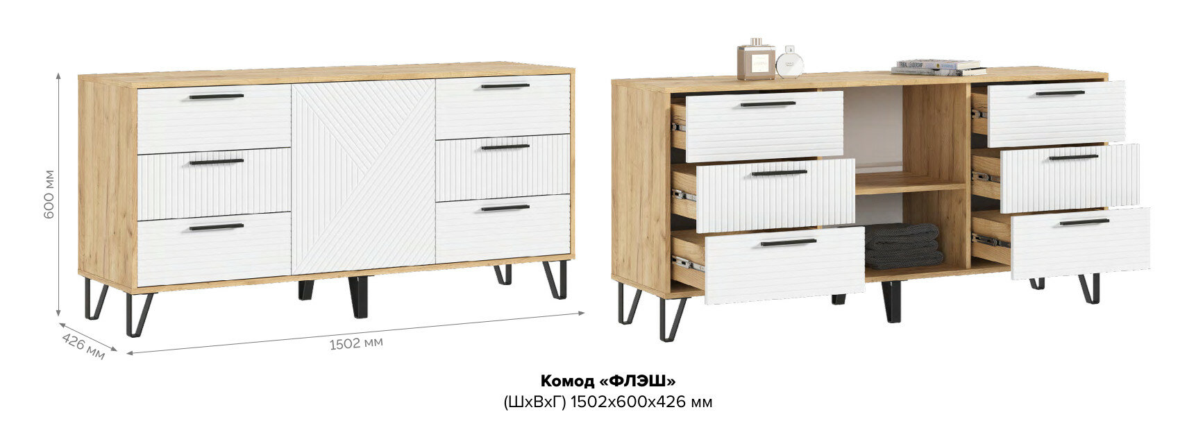 Комод Флэш (1500) Браш Вайт/дуб крафт, размер 1502х730х426 мм интересное: