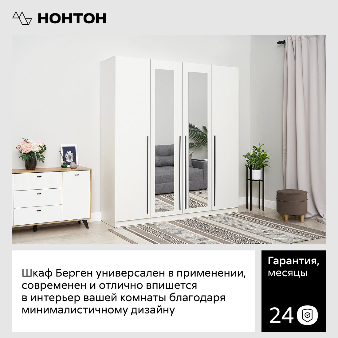 Шкаф для одежды с зеркалами и полками распашной Нонтон Берген, белое дерево, 200х52х220 см интересное: