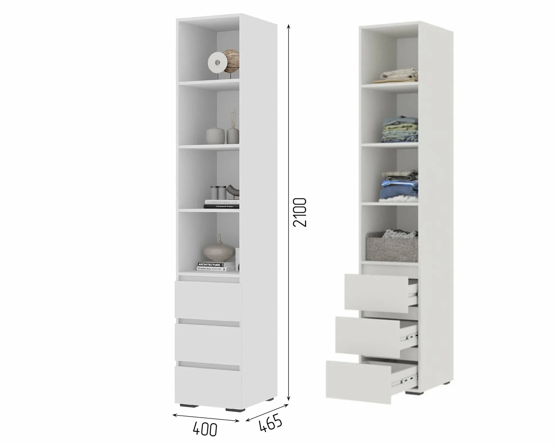 Пенал открытый, размеры 400х2100х460 мм, корпус и фасад ЛДСП белый шагрень, наполнение: полки и ящики.
