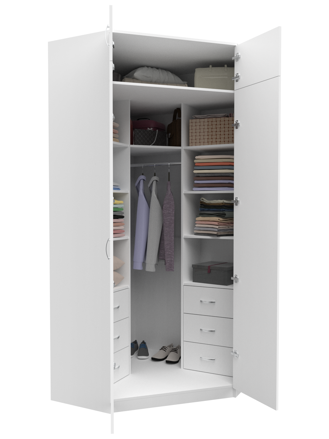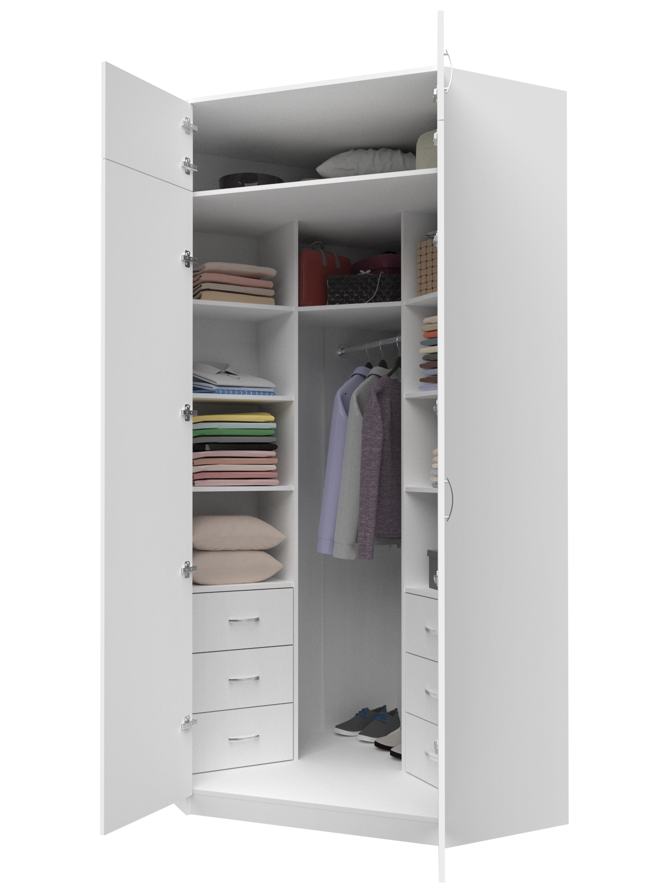 Шкаф угловой распашной Анри-2 с 3 ящиками, 6 полками и штангой для вешалок, белый