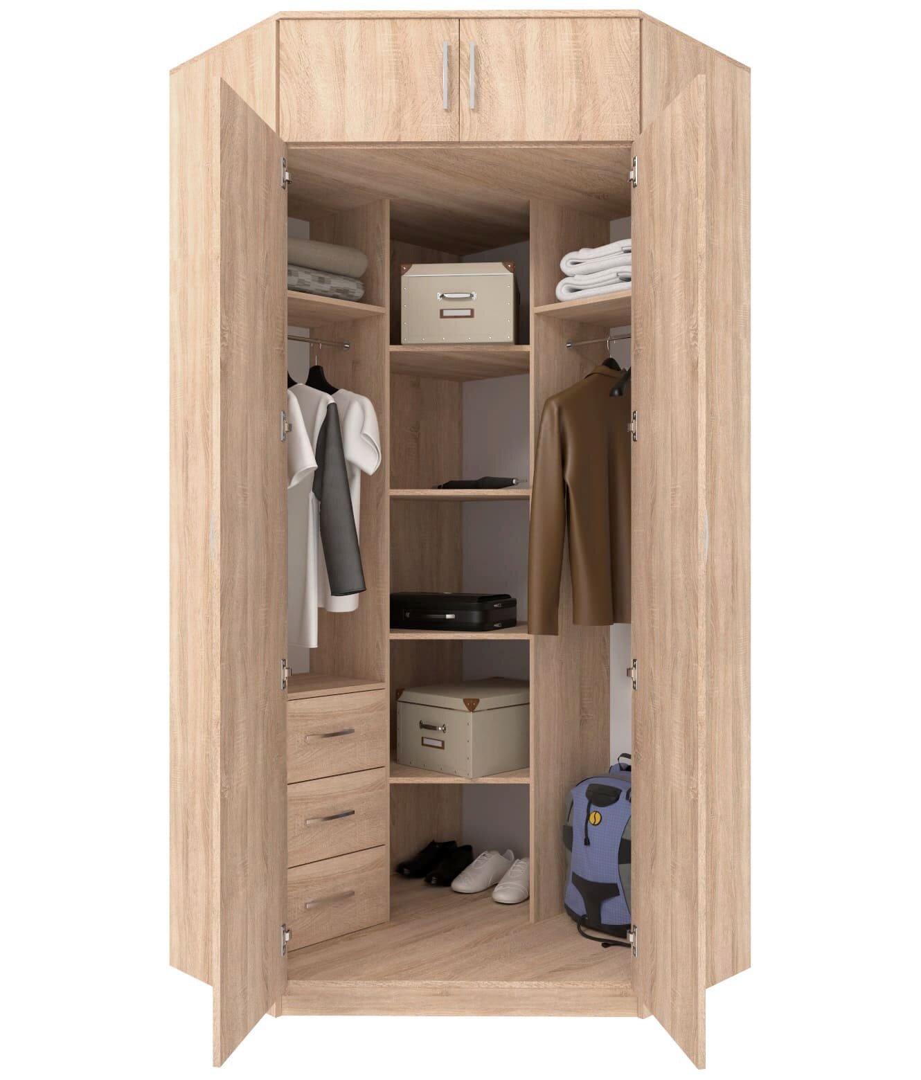 Шкаф угловой распашной Анри-2 с 3 ящиками, 6 полками и штангой для вешалок
