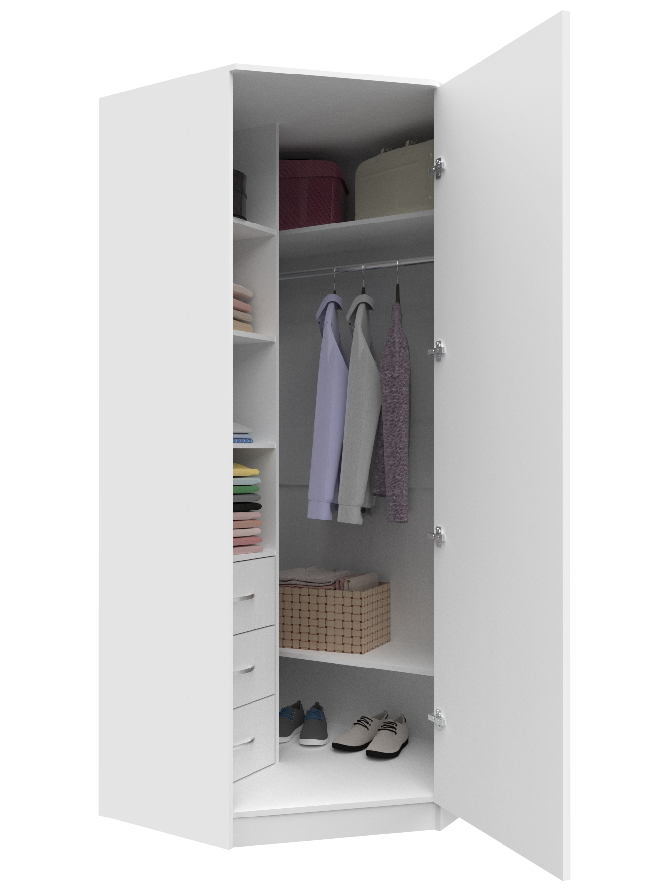 Шкаф угловой распашной Анри-5 с 3 ящиками, 7 полками и 2 штангами для вешалок, белый