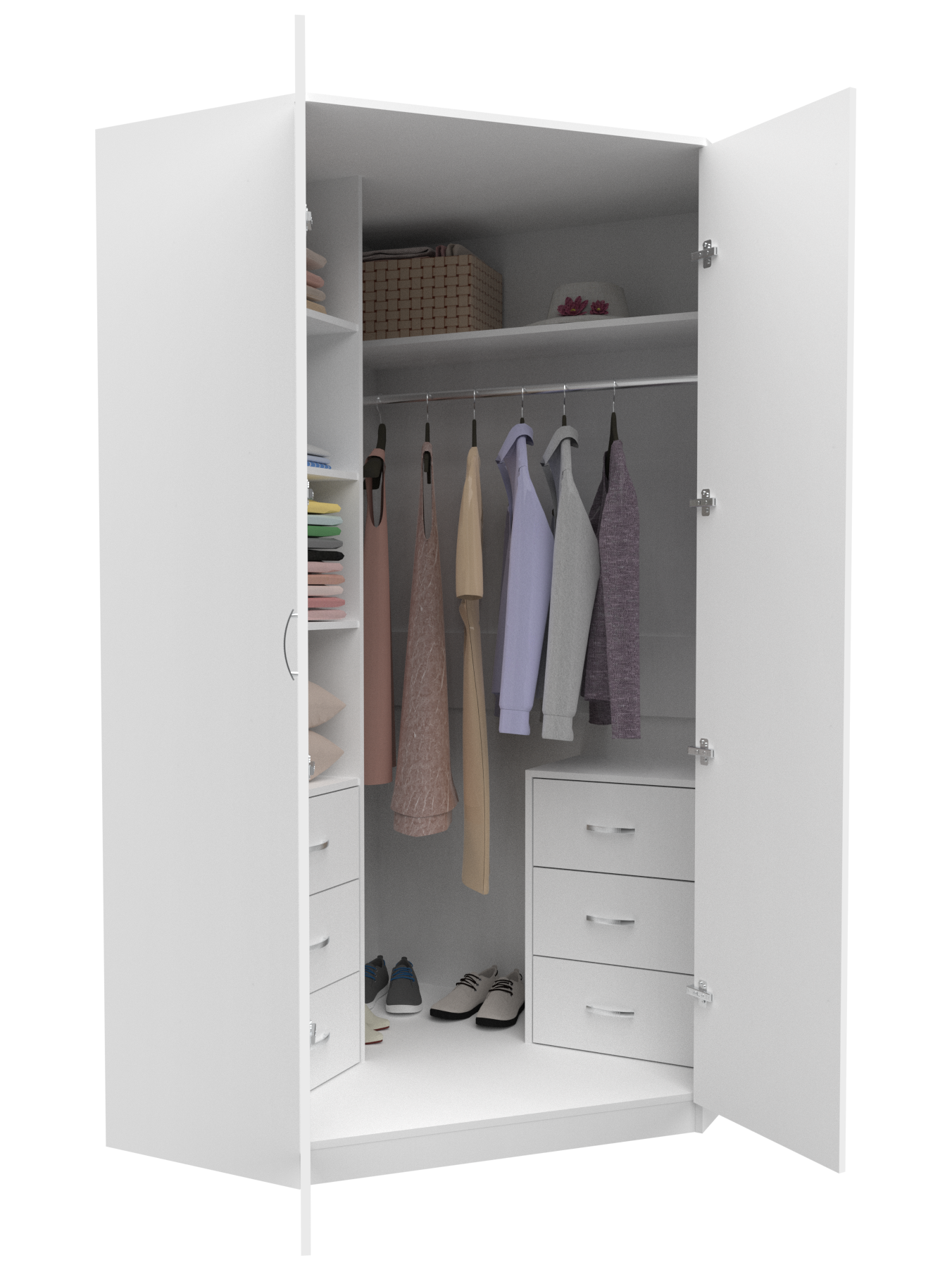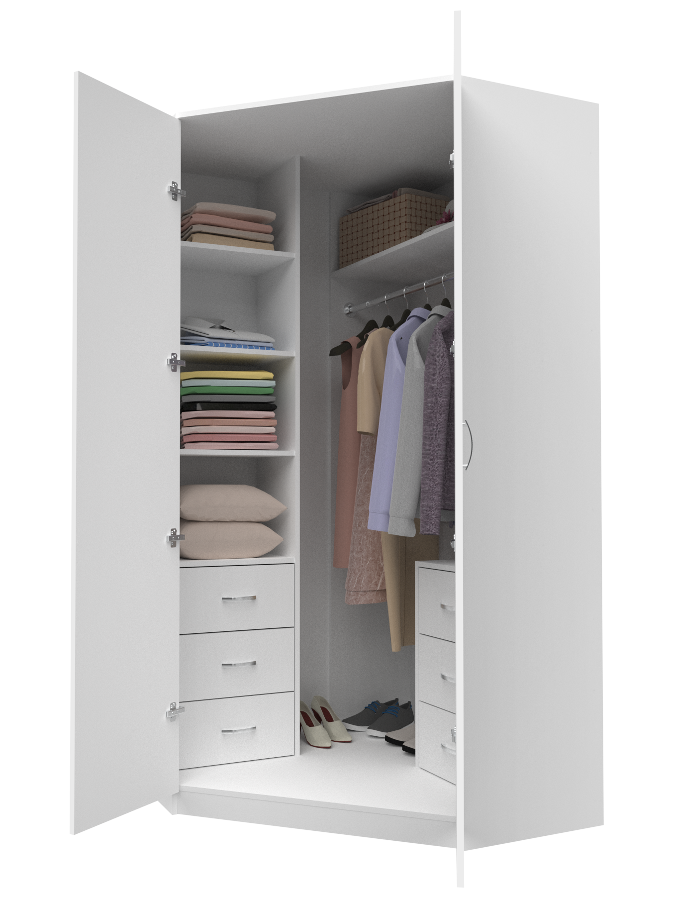 Шкаф угловой распашной Анри-2 с 3 ящиками, 6 полками и штангой для вешалок, белый