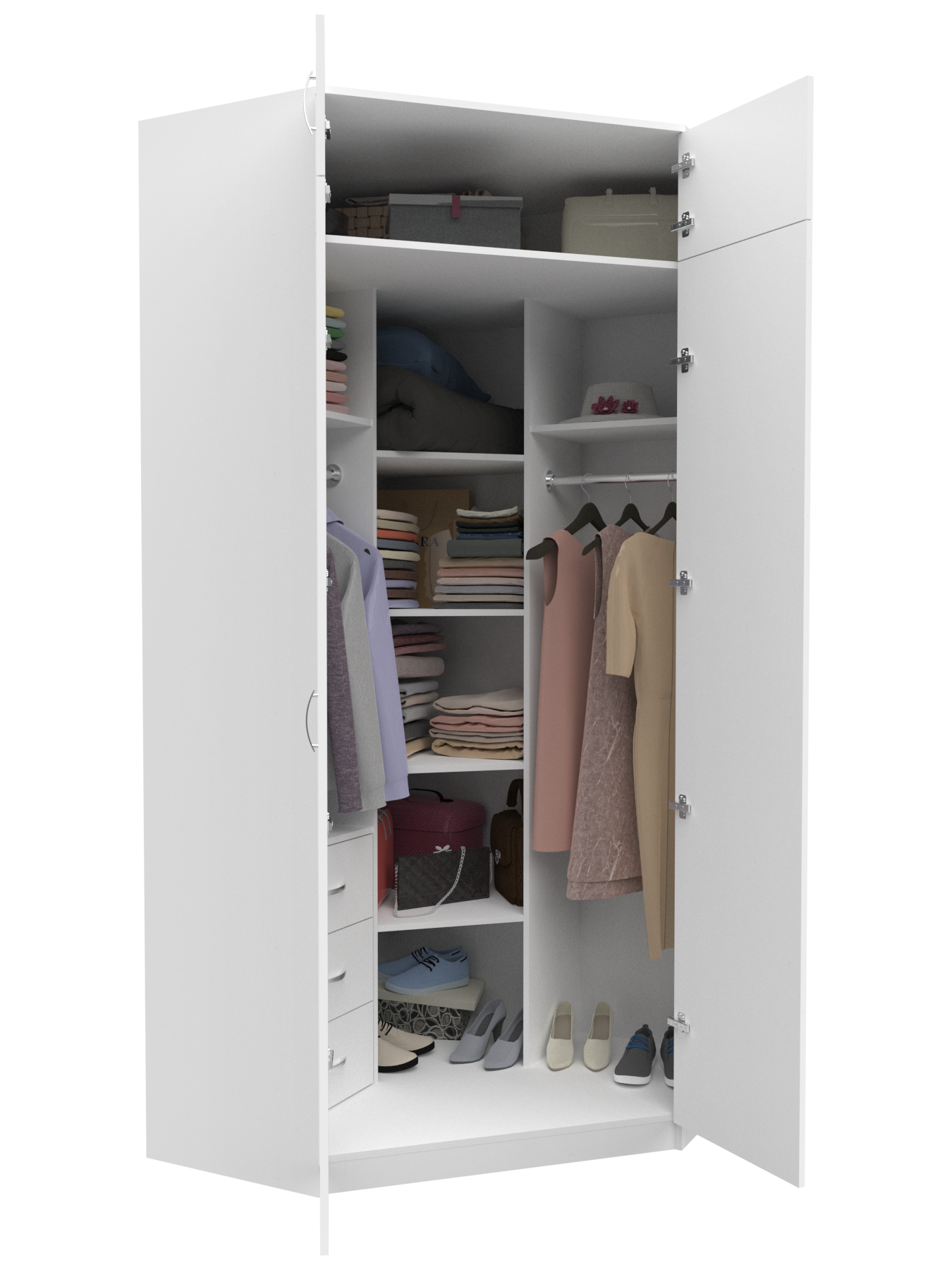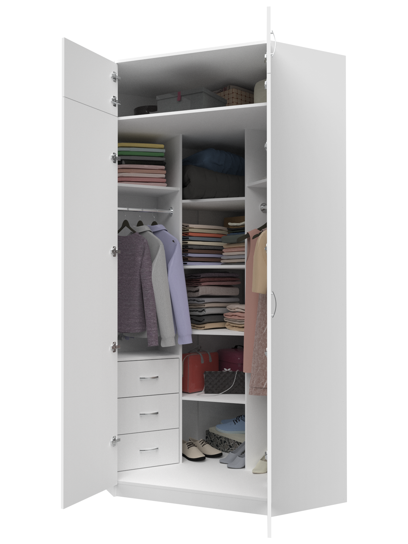 Шкаф угловой распашной Анри-5 с 3 ящиками, 7 полками и 2 штангами для вешалок, белый