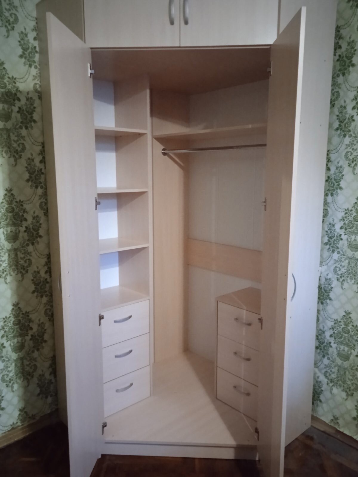 Шкаф угловой распашной Анри-4 с 6 ящиками, 5 полками и штангой для вешалок