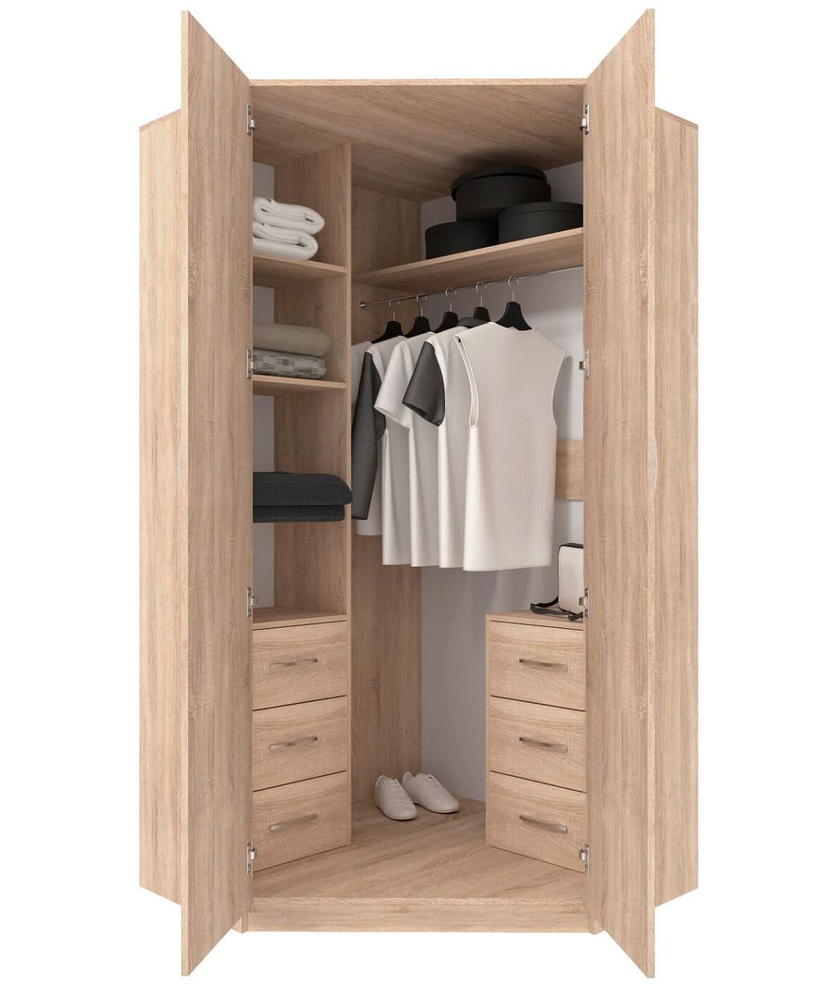 Шкаф угловой распашной Анри-2 с 3 ящиками, 6 полками и штангой для вешалок