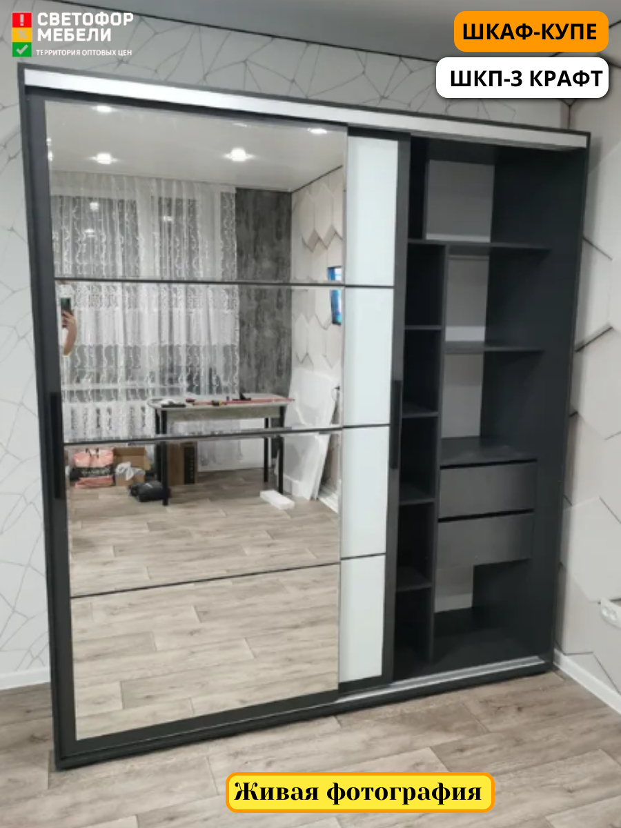 Шкаф-купе Мебельный Рай ШКП-3 Крафт, Графит, раздвижные дверцы со стеклом и зеркалом, графит, 1602х2176х594