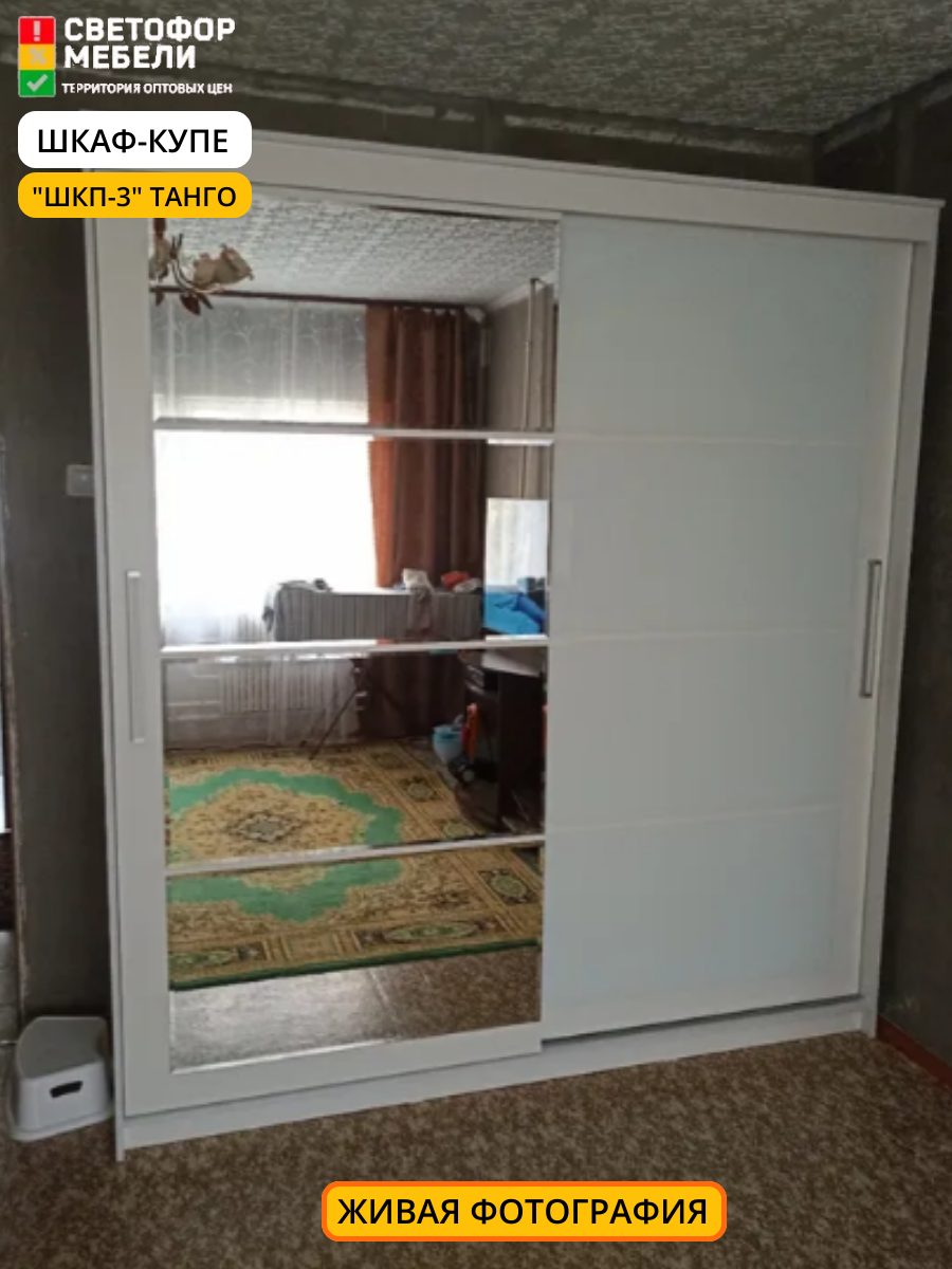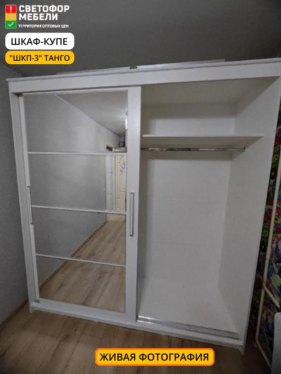 Шкаф-купе Мебельный Рай ШКП-3, раздвижные дверцы со стеклом и зеркалом, 1601х2200х600, Белый текстурный