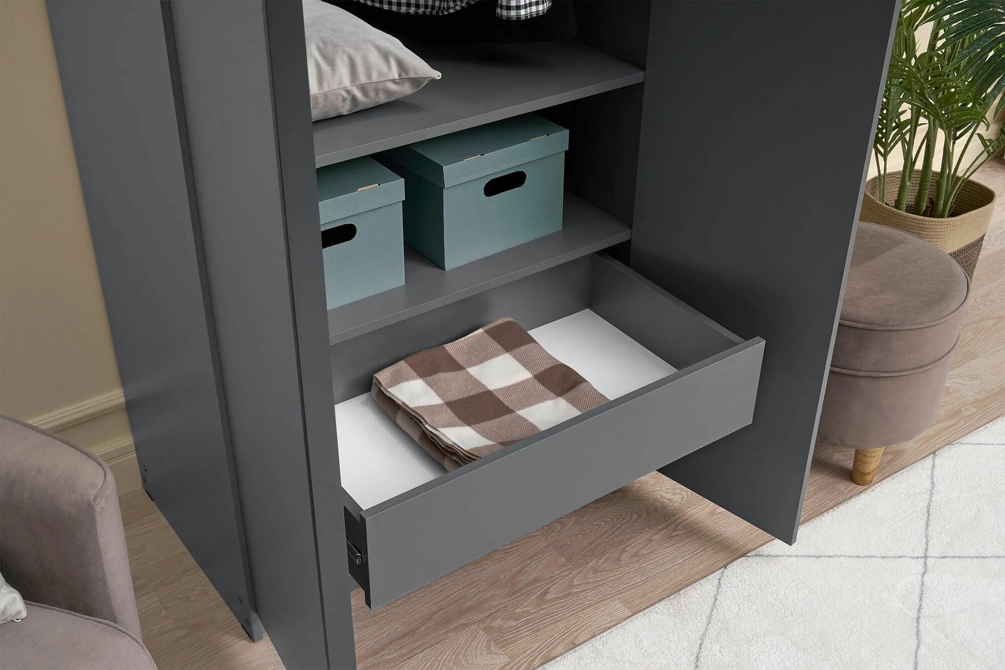 СохранитьШкаф распашной для одежды Лувр, 2-х дверный, серый графит, с доводчиками и выдвижными ящиками, 80.1х50.6х221.6 см интересное: