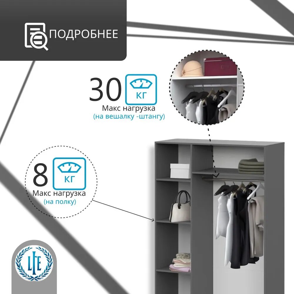 Угловой шкаф распашной для одежды графит серый Лувр, модульный, с 15-ю полками