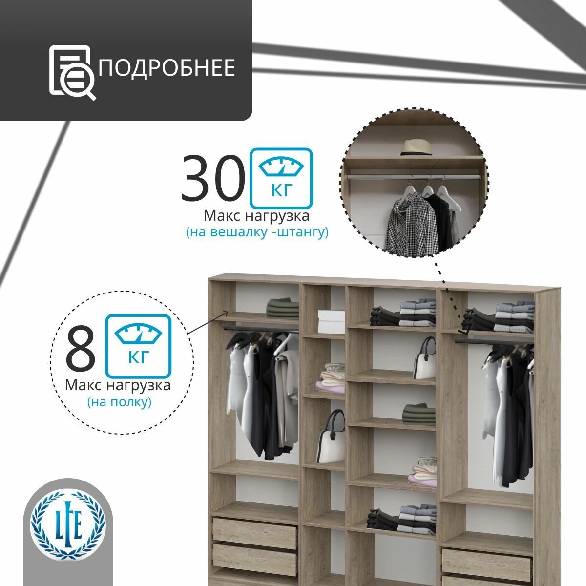 СохранитьШкаф для одежды распашной Лувр эндгрейн/меланж(капучино), 7-ми дверный, модульный, с доводчиками, 4-мя выдвижными ящиками, 15-ю полками и 2-мя штангами, 280.3х50.6х221.6 см интересное: