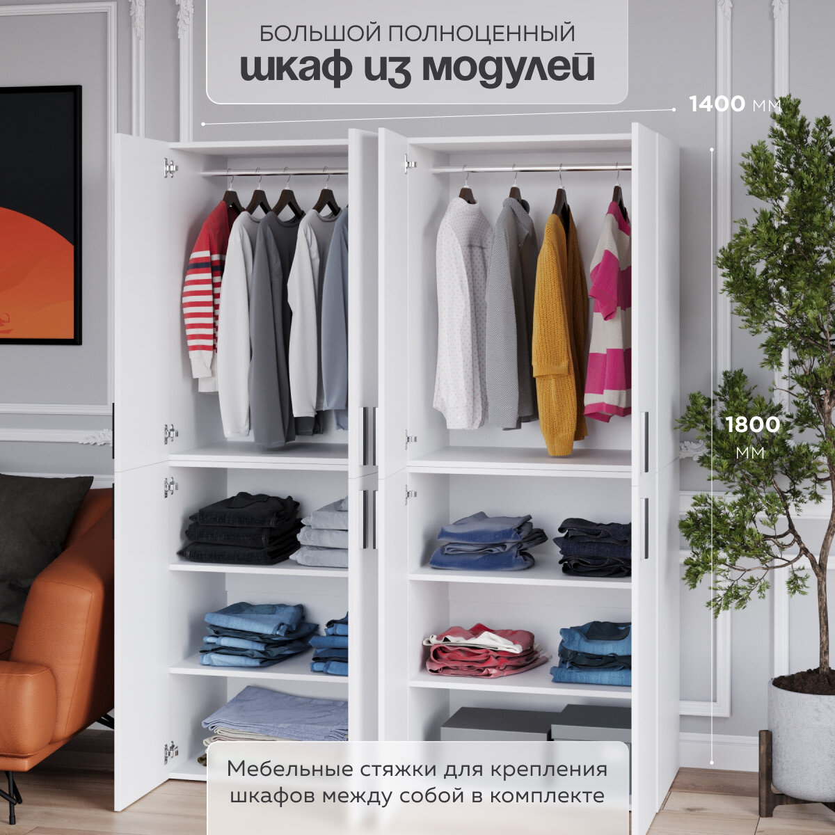 Шкаф для одежды распашной модульный «Twin» 180х45х140; цвет белый; 4 секции