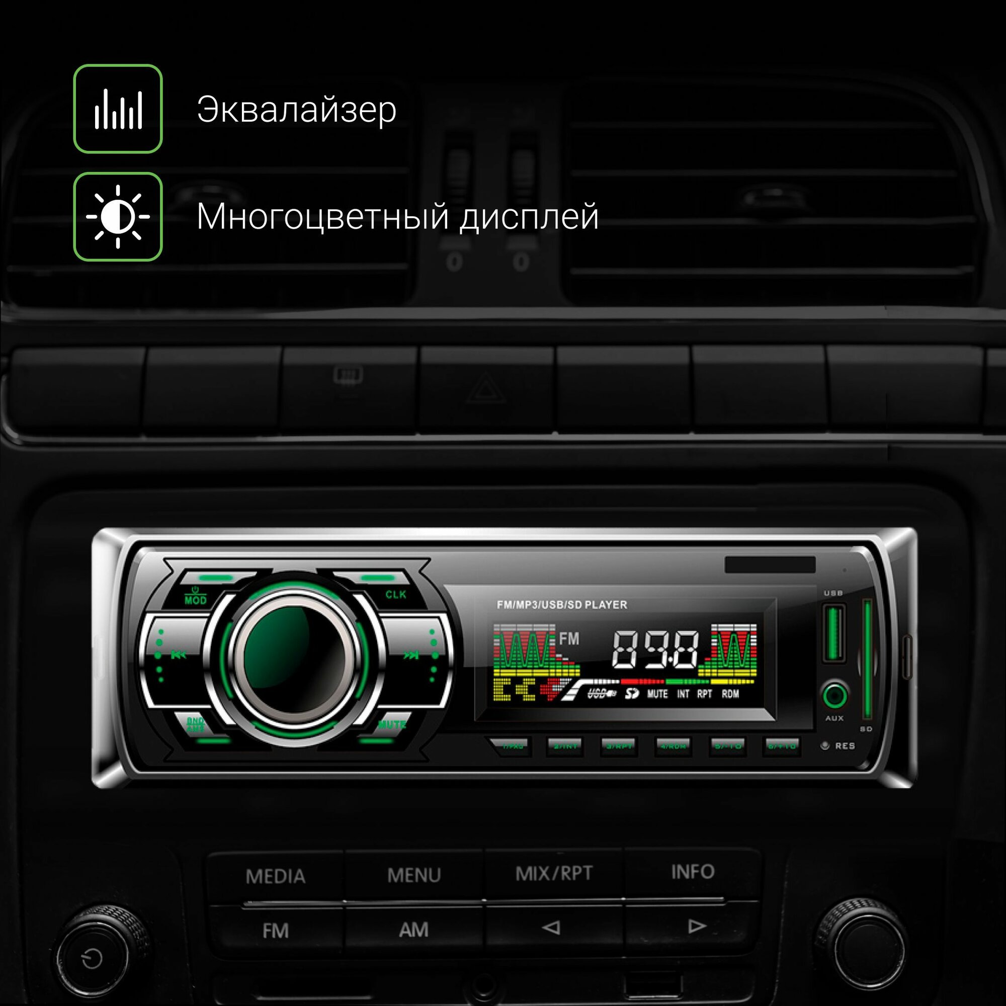 | Плюсы: | Размер верно указан, в пазы встала чуть туго, но и ничего дополнительно делать не пришлось. Переключает радиостанции быстро, как и треки с флешки. |