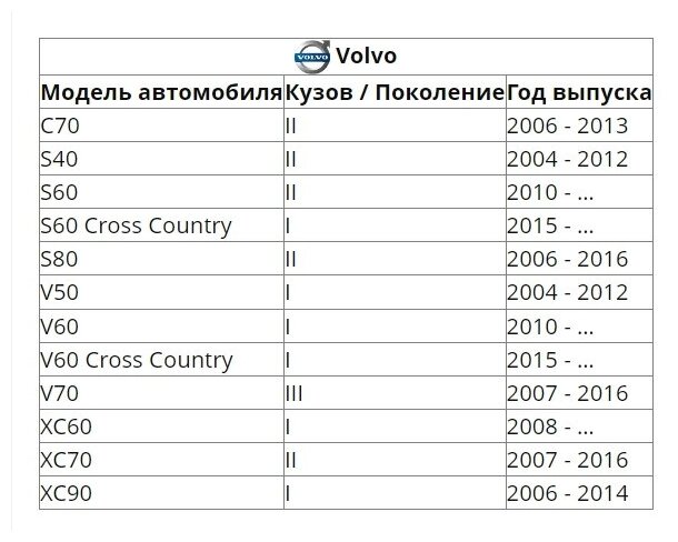 | Модель автомобиля | Volvo C70 / Volvo S40 / Volvo S60 / Volvo S80 / Volvo V50 / Volvo V60 / Volvo V70 / Volvo XC60 / Volvo XC70 / Volvo XC90 |
