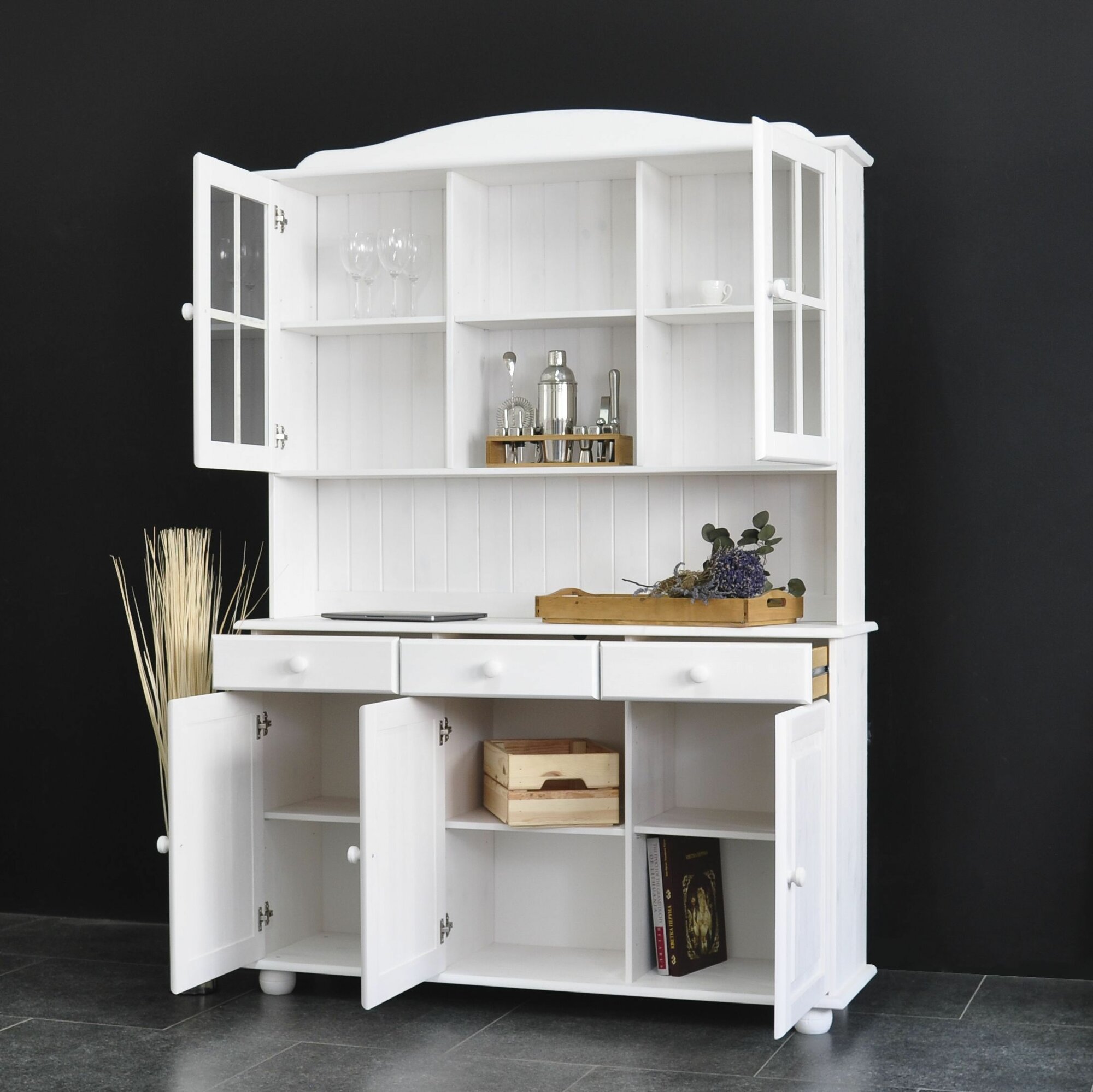 Dipriz Шкаф Лена 4 двери из сосны, с полками (верхняя часть буфета Лена), белый воск
