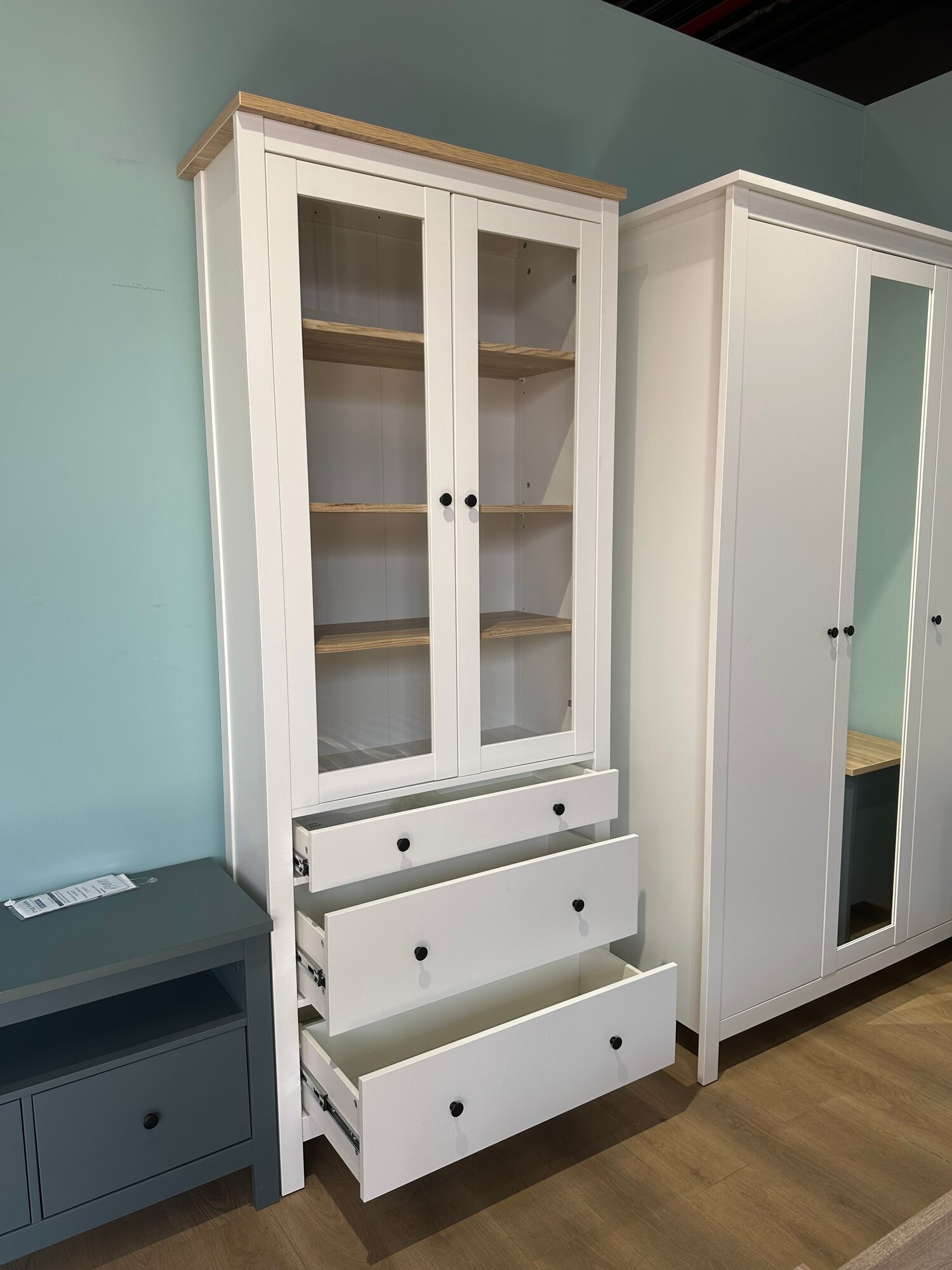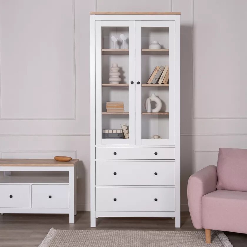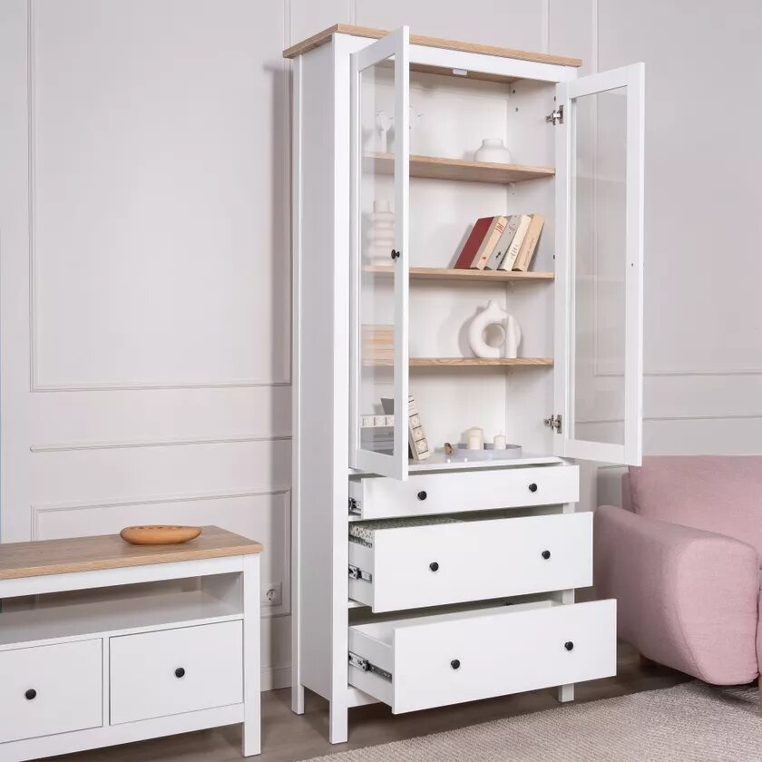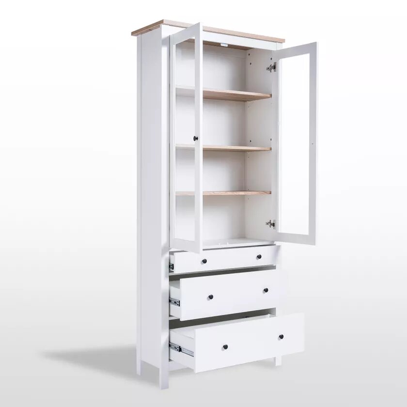 Шкаф с витриной ГУД ЛАКК сага, 3 ящика, 50 х 41 х 215 см, шариковые направляющие с доводчиком, белый/ясень