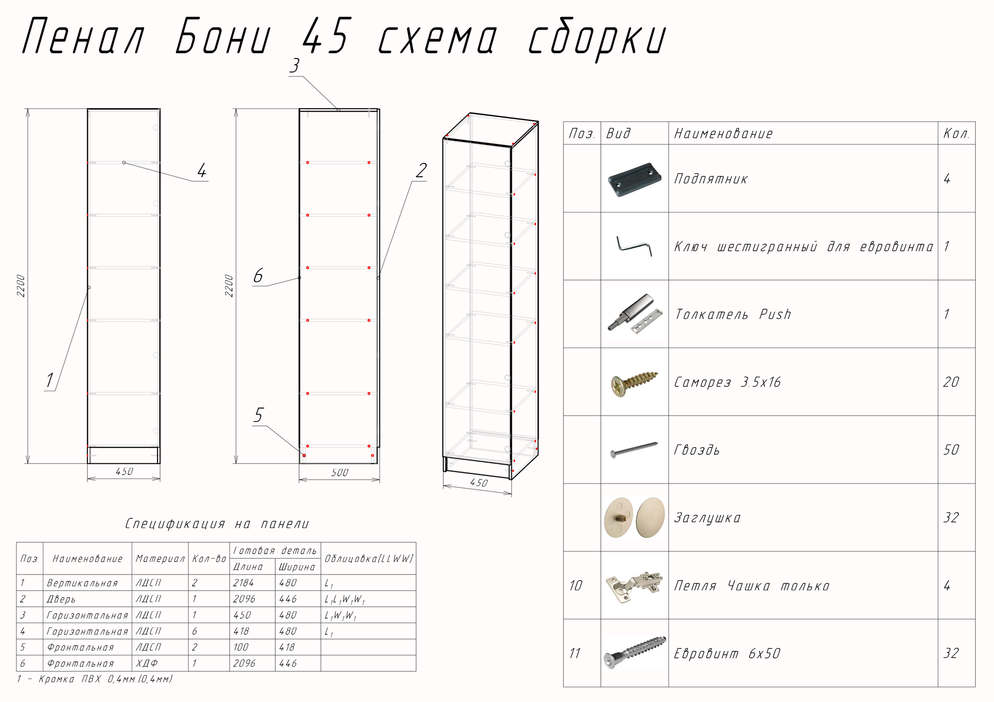 Шкаф Пенал в стиле Лофт модель Бони 45 Белый (ШхВхГ) 45х220х50см