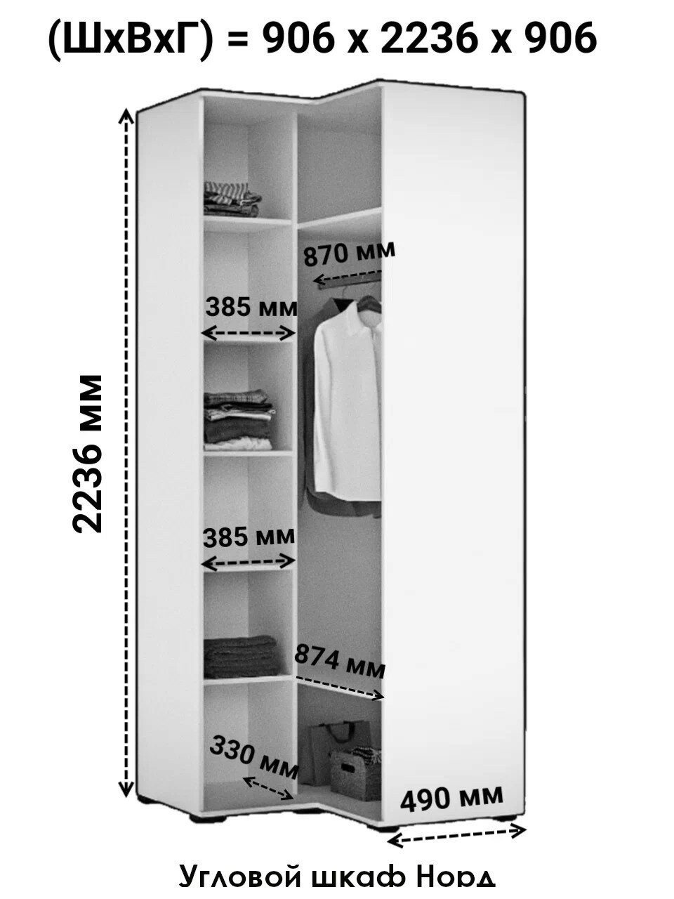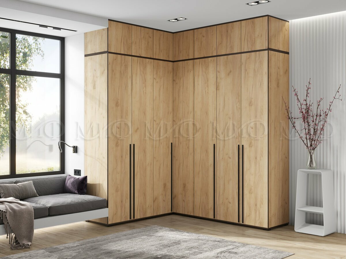 СохранитьВысокий угловой шкаф Миф Норд с полками и штангой, цвет Дуб Крафт, размер 906х906 h2236мм, торец шкафа 510мм интересное: