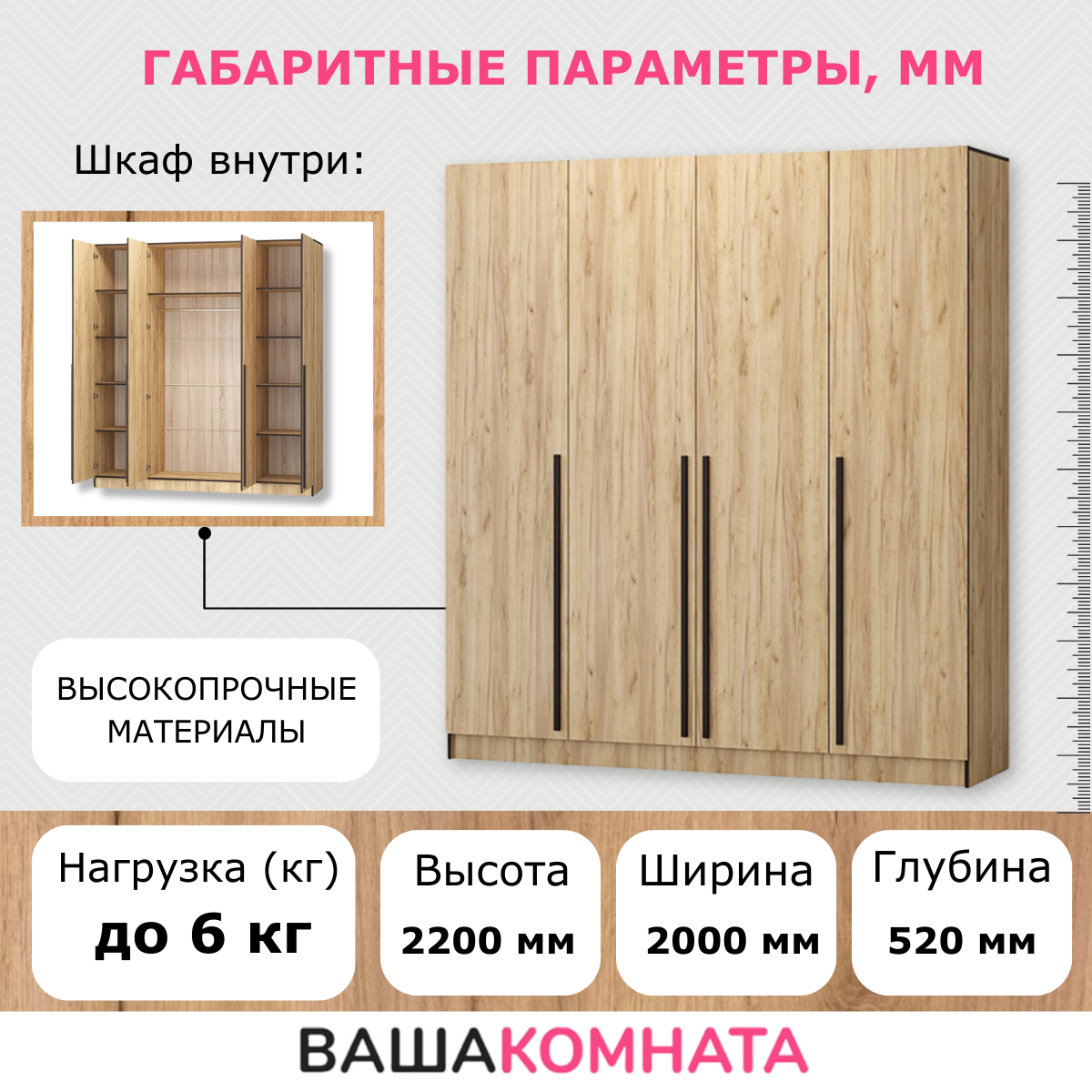 Шкаф четырехдверный распашной "Бастион " 2,0 м, цвет дуб крафт золотой , 4 двери, материал ЛДСП интересное: