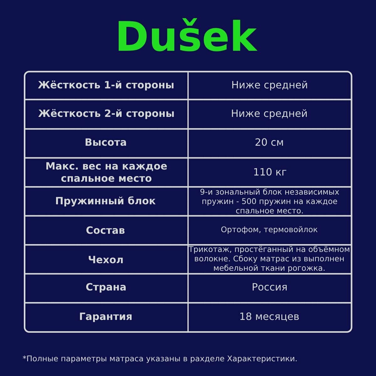 Двуспальный матрас 180х190 DUŠEK Memory S/M ортопедический эффект жёсткость мягкий/средний независимый пружинный блок