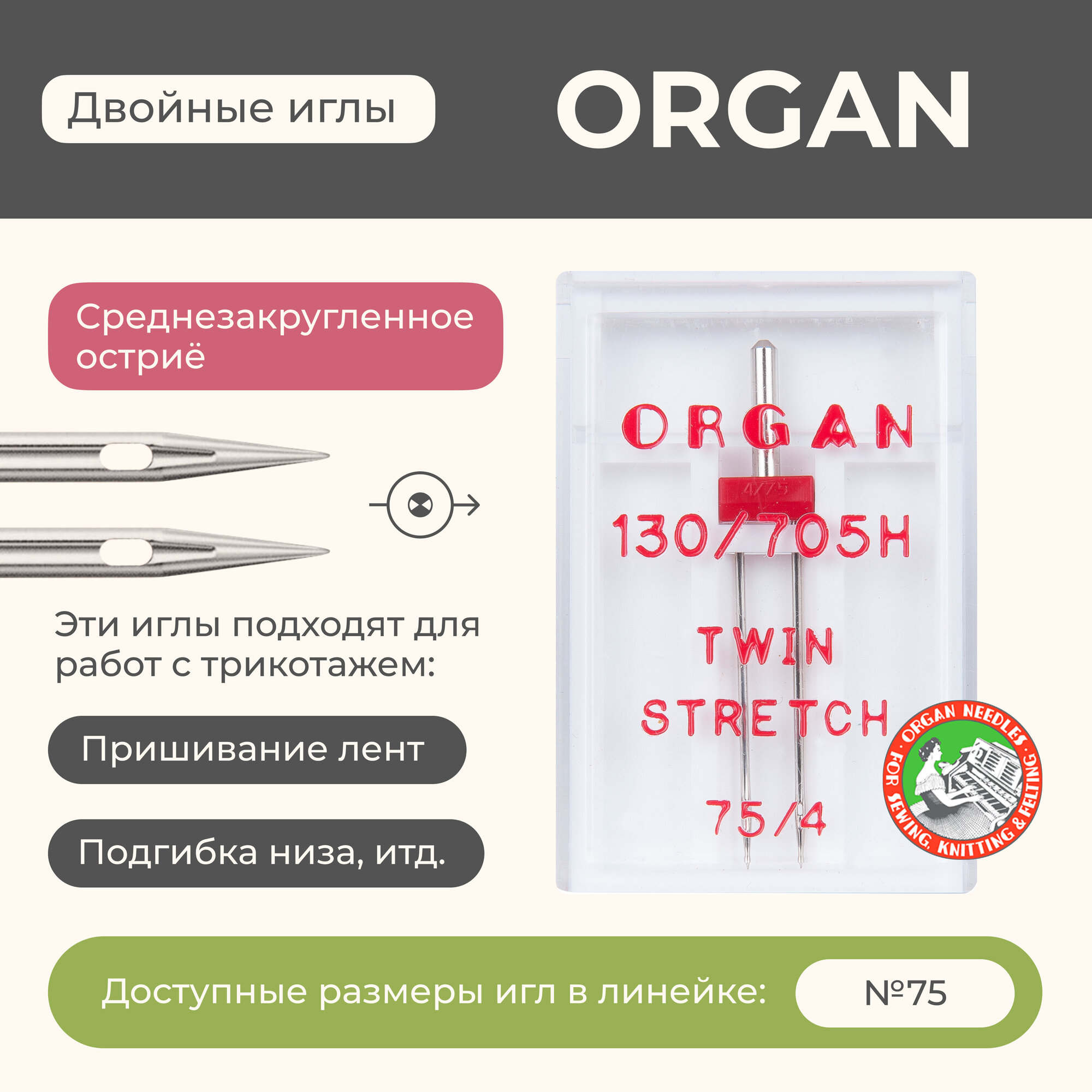 Иглы для швейной машины ORGAN 75/4, 1 шт, в блистере, двойные трикотаж