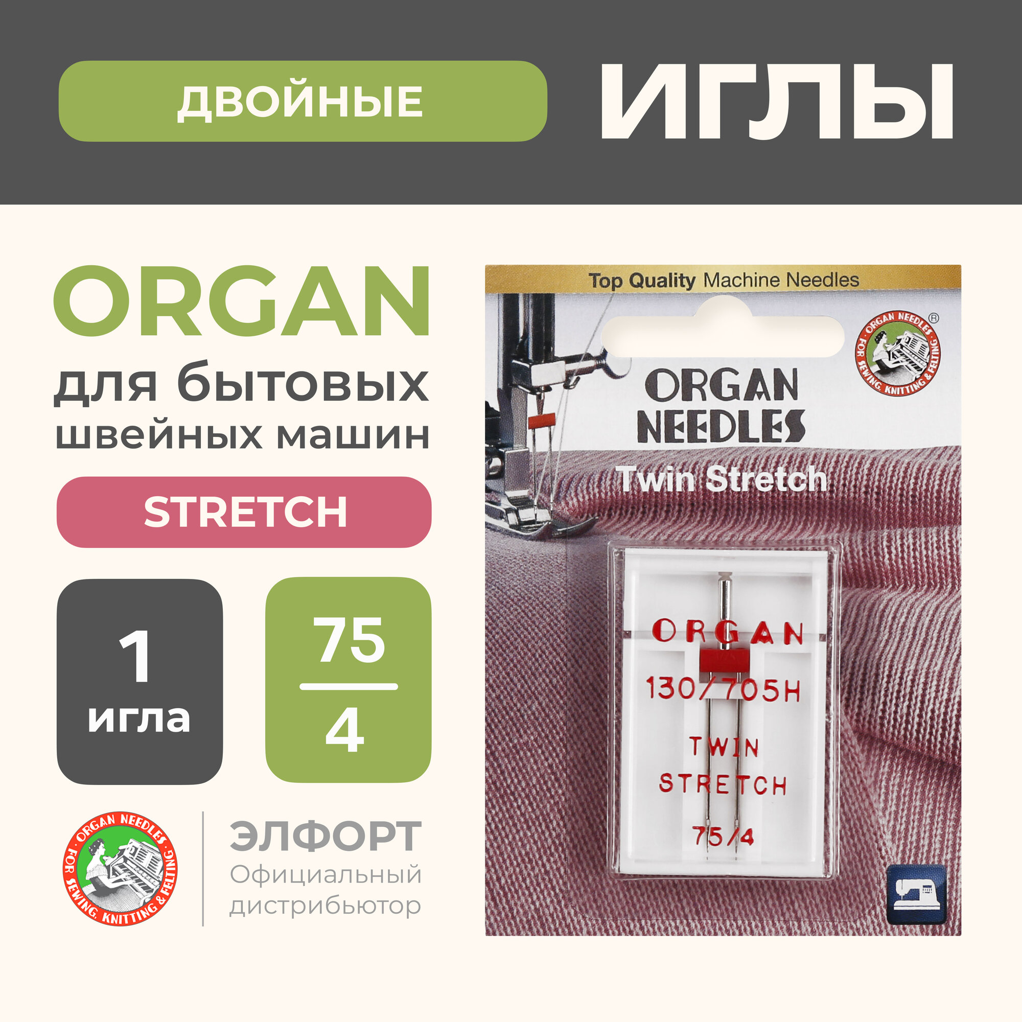 ORGAN Игла для бытовых швейных машин, двойная, для стрейч-ткани, №75/4