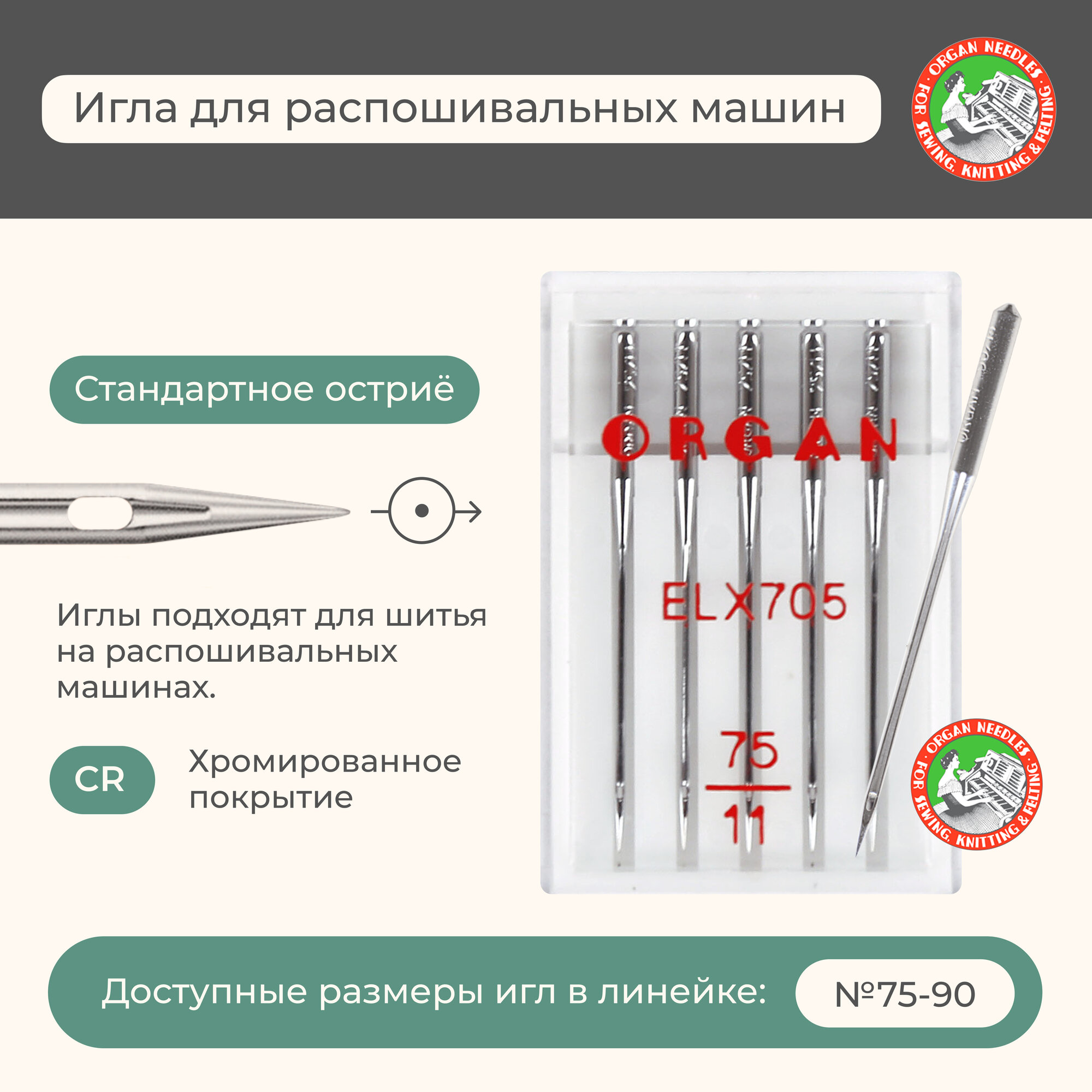 Иглы ORGAN EL 705 CR CR 5/90, Blister, 1 шт (ORGAN)