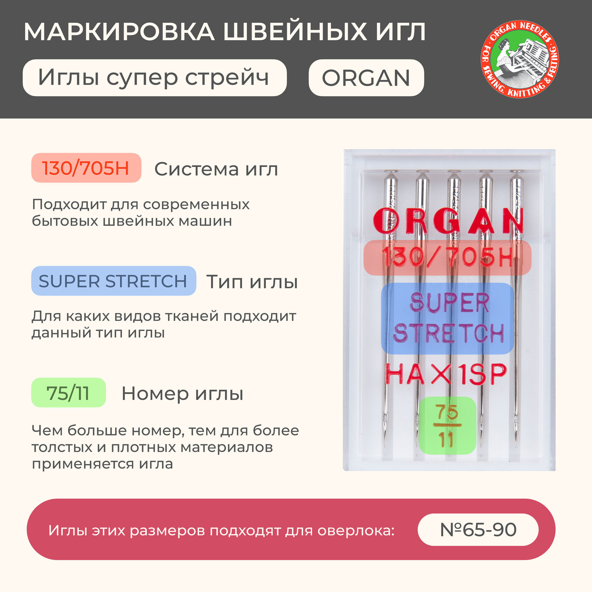 ORGAN Иглы для бытовых швейных машин, для супер-стрейч, №75, 5 шт