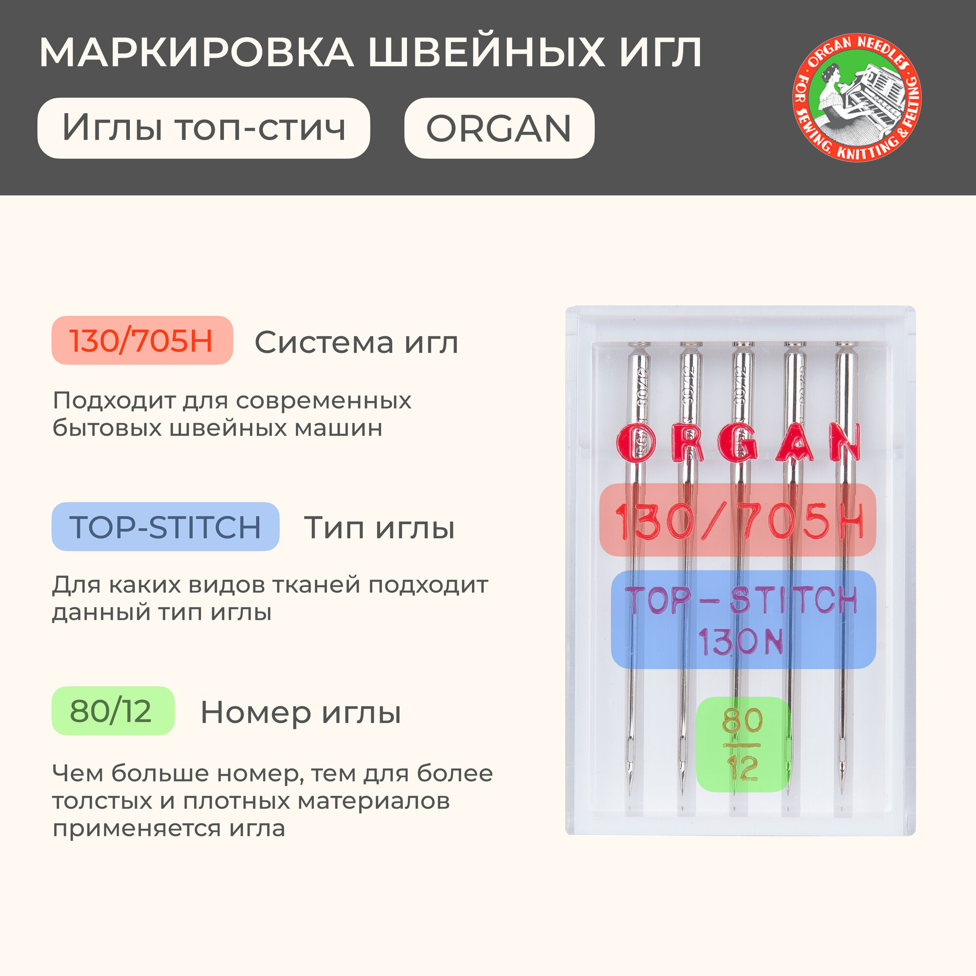 Иглы для швейной машины ORGAN для декоративных работ TOP STITCH, № 80, упаковка 5 шт