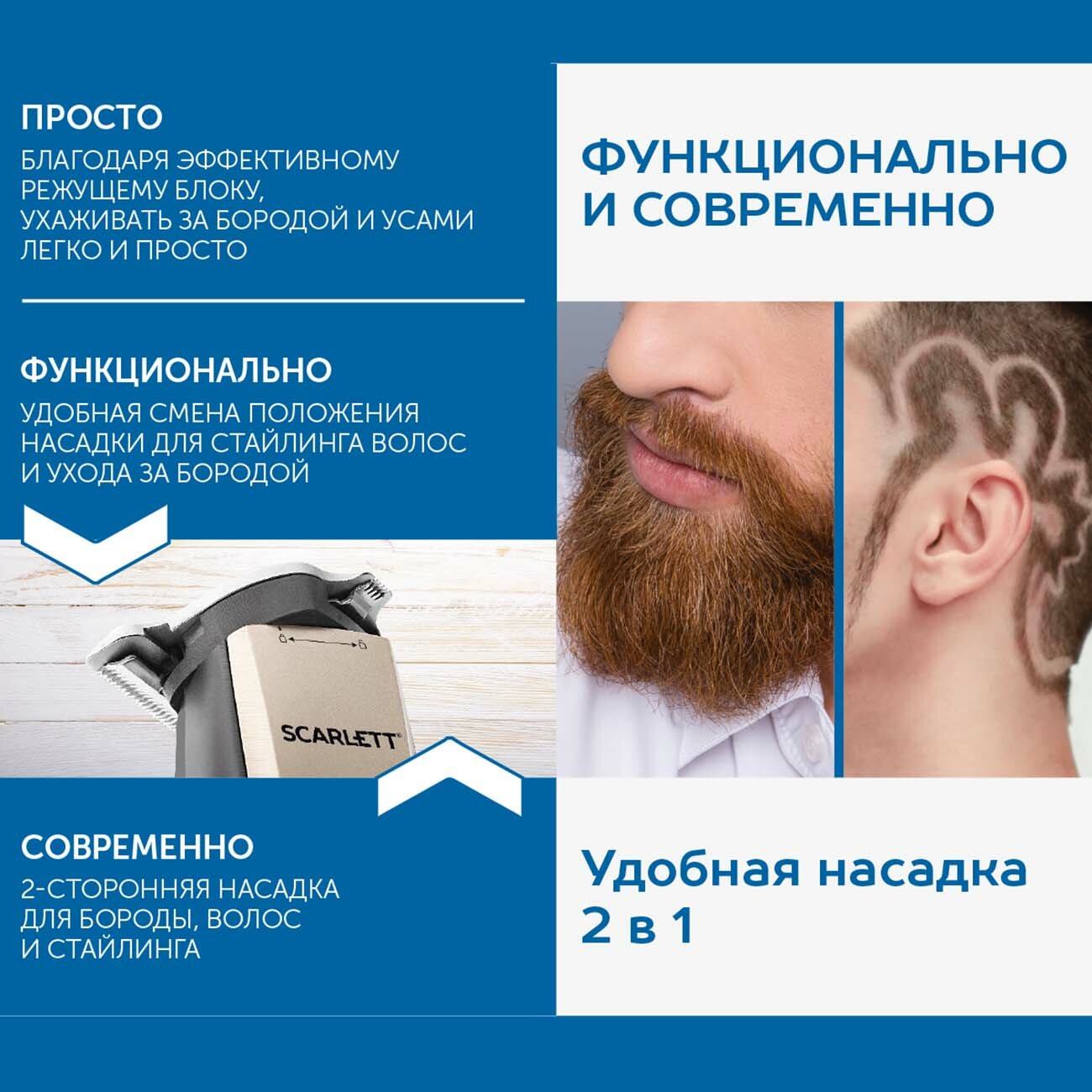 | Плюсы: | Двухсторонняя насадка для стрижки бороды, лезвия из нержавейки, регулировка длины стрижки. |