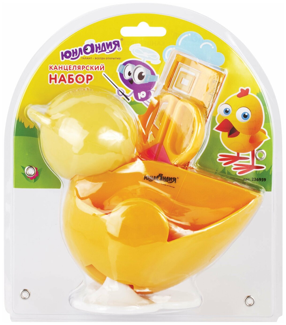 Канцелярский детский набор юнландия "ЦЫПЛЕНОК", 4 предмета: подставка, линейка со скрепками, ножницы, ластик, цвет желтый, блистер, 236959