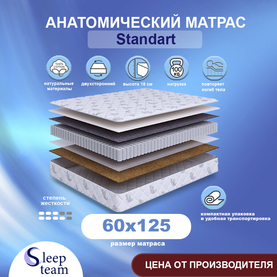Матрас пружинный SleepTeam Standart 125х190, с независимыми пружинами, высота 20 см, полутороспальный