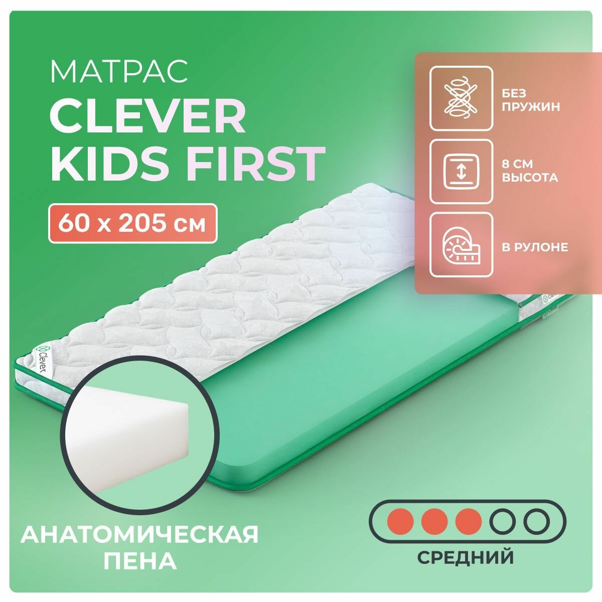 Детский матрас 65х205 Clever Kids First, для детей и подростков, беспружинный, cредне-жёсткий, ППУ, пена, детский 205х65