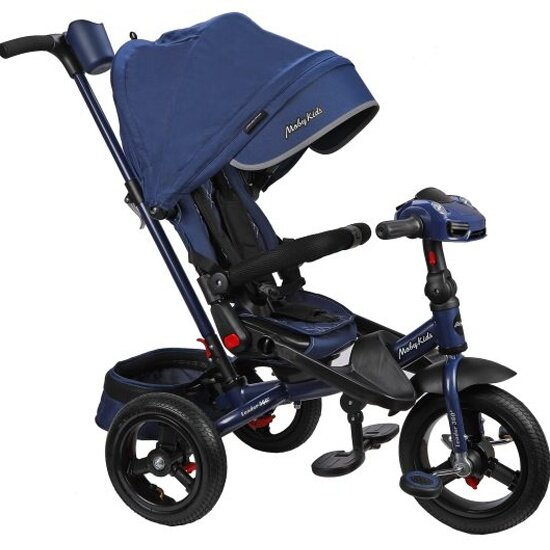 Велосипед трехколесный детский Moby Kids, синий, надувное.кол.12/10",поворотн.сиден, музык.USB,блок,функция свободн.колеса,сумка