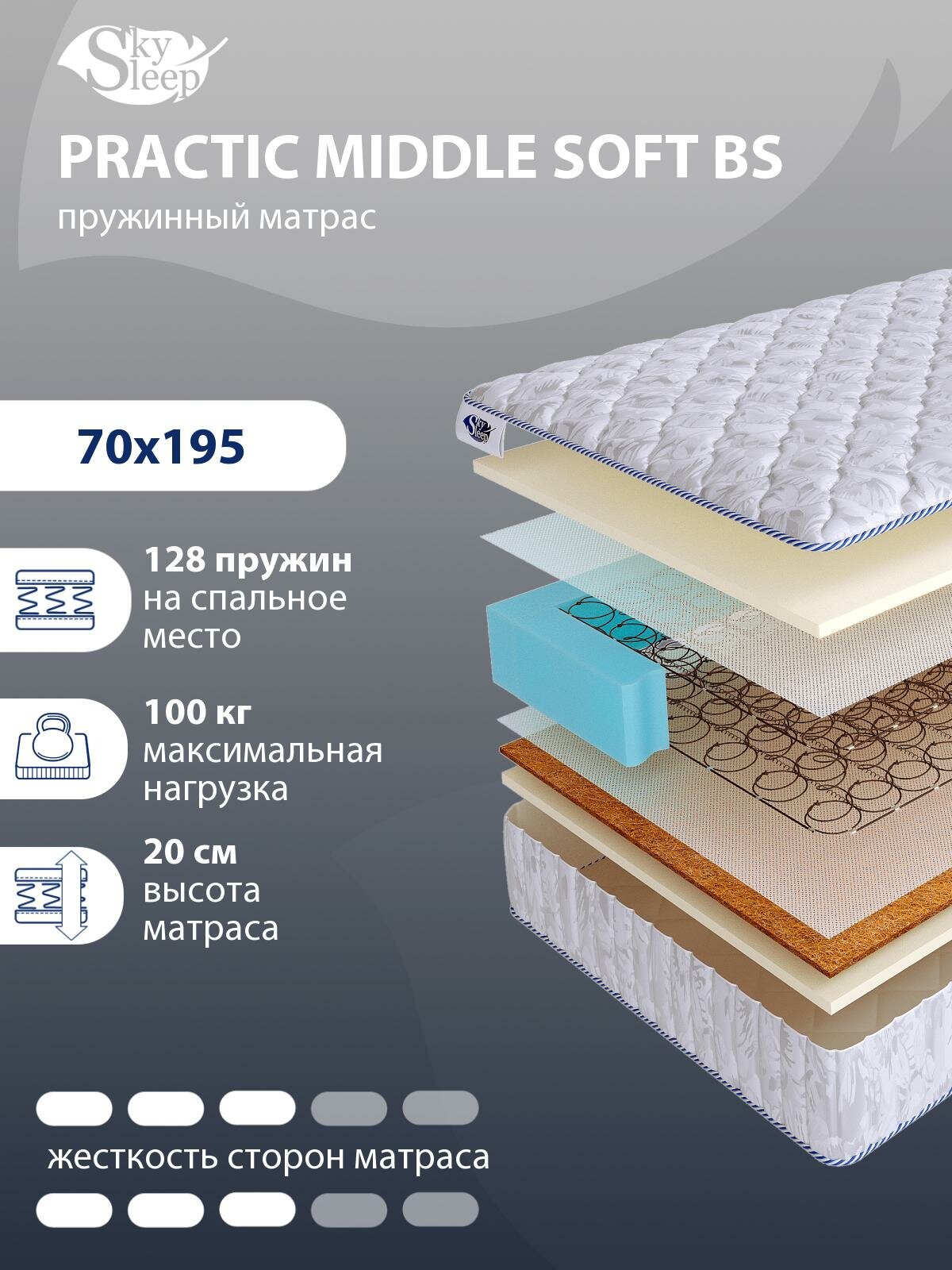 Купить Ортопедический матрас SkySleep PRACTIC MIDDLE SOFT BS с зависимым пружинным блоком для кровати тахты 70x195