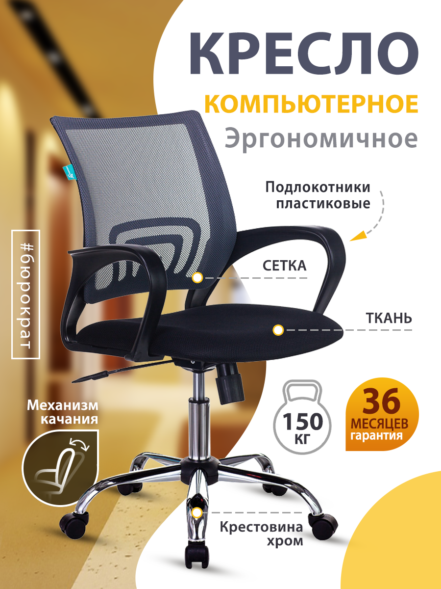 Кресло Бюрократ компьютерное серое, черное, сетка, ткань, крестовина металл - Офисное рабочее кресло оператора