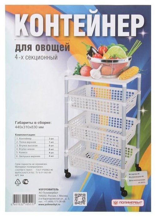 Контейнер для овощей, 4 секции, на колесах, 440х310х830 мм