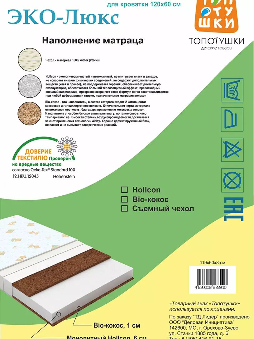 Матрац Топотушки Эко-Лайн Эко-Люкс бязь арт.50 (120*60*8) интересное: