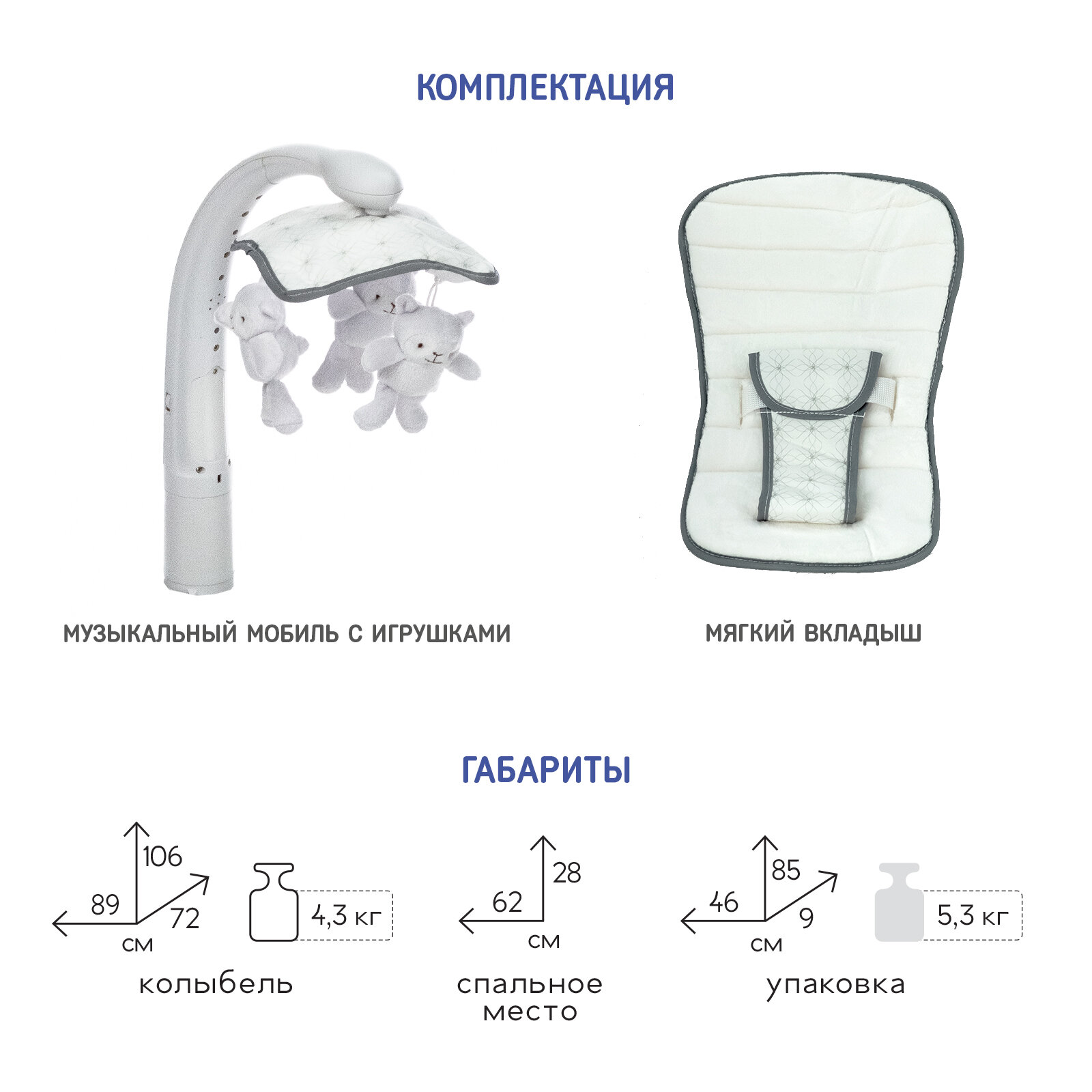 | Плюсы: | Легкая, компактная, в комплекте идёт мобиль с игрушками и подушечка. |