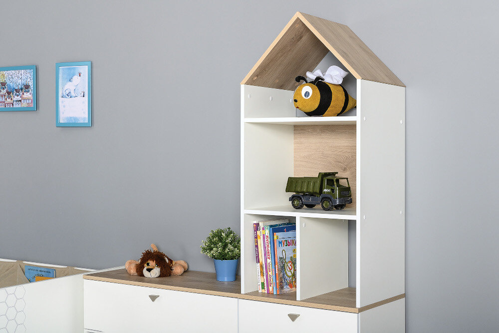 Стеллаж домик Моби Эйп 13.14 размер 53х41,5х183,8 см цвет белый крыша дуб белый интересное: