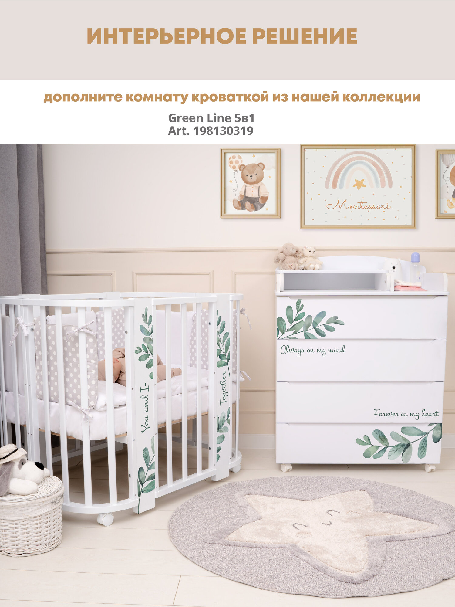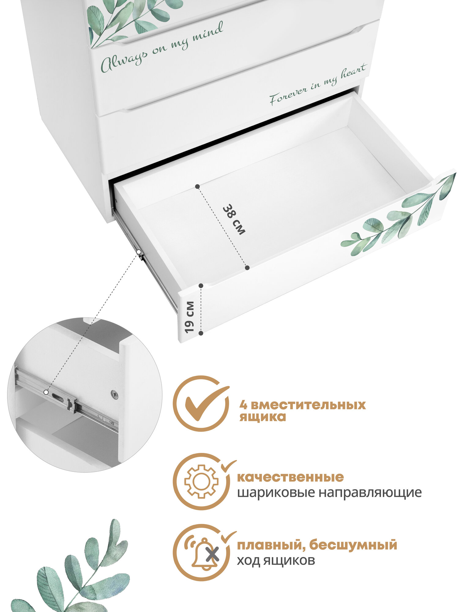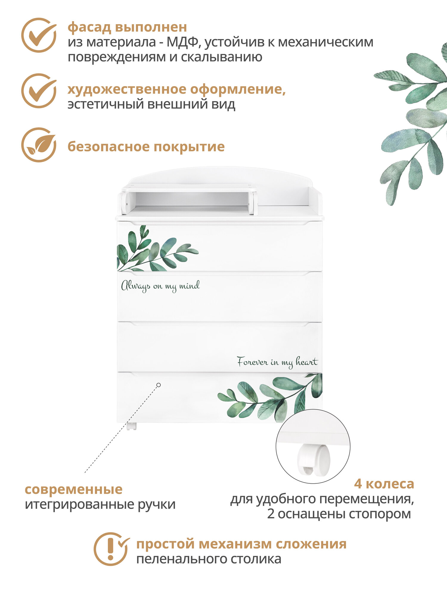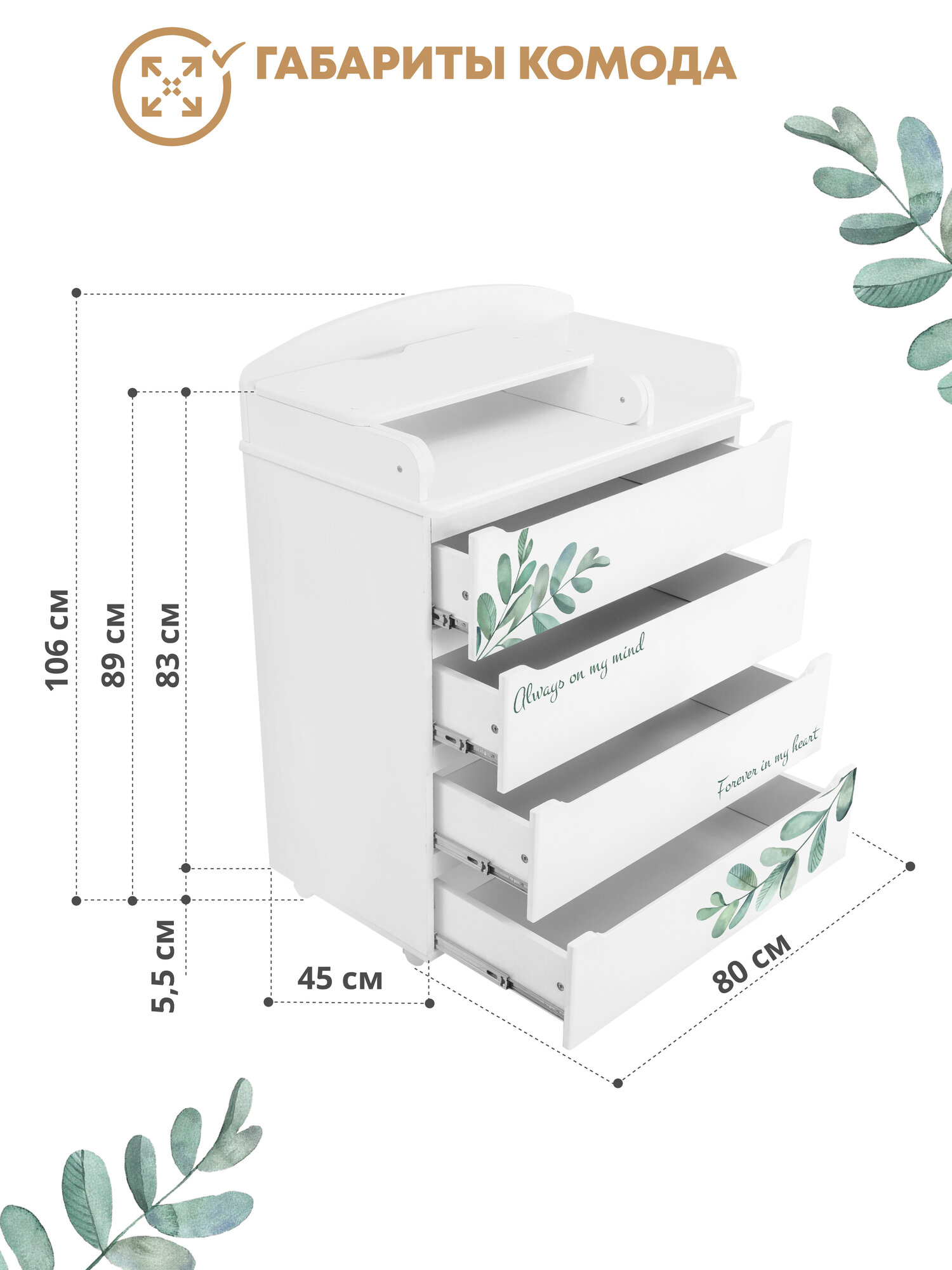 Детский пеленальный комод Indigo Green Line 800/4 с ящиками, листочки интересное: