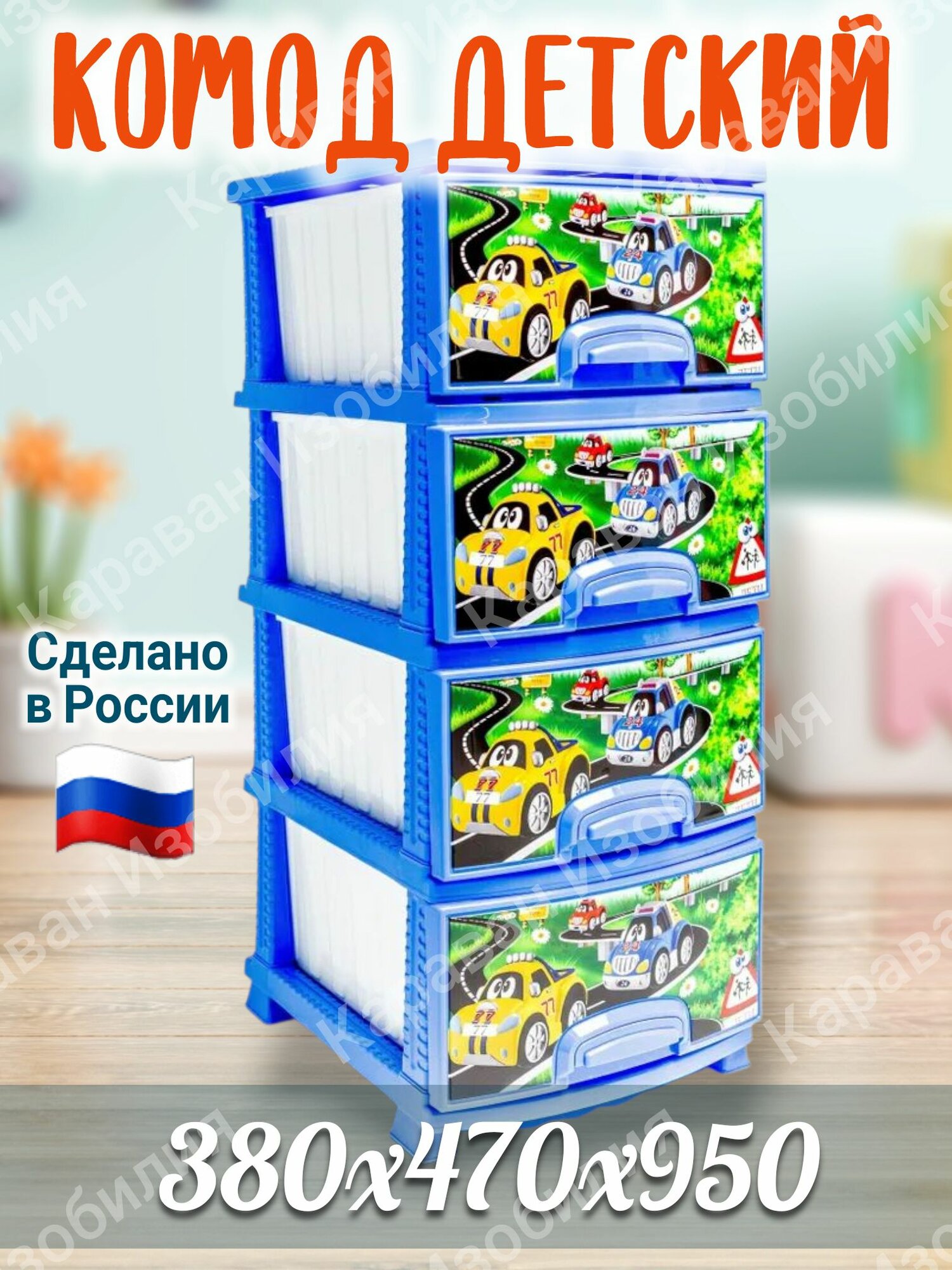 Яркий комод детский комод "Тачки" (голубой) 380*470*950 мм, 4 вместительных ящика