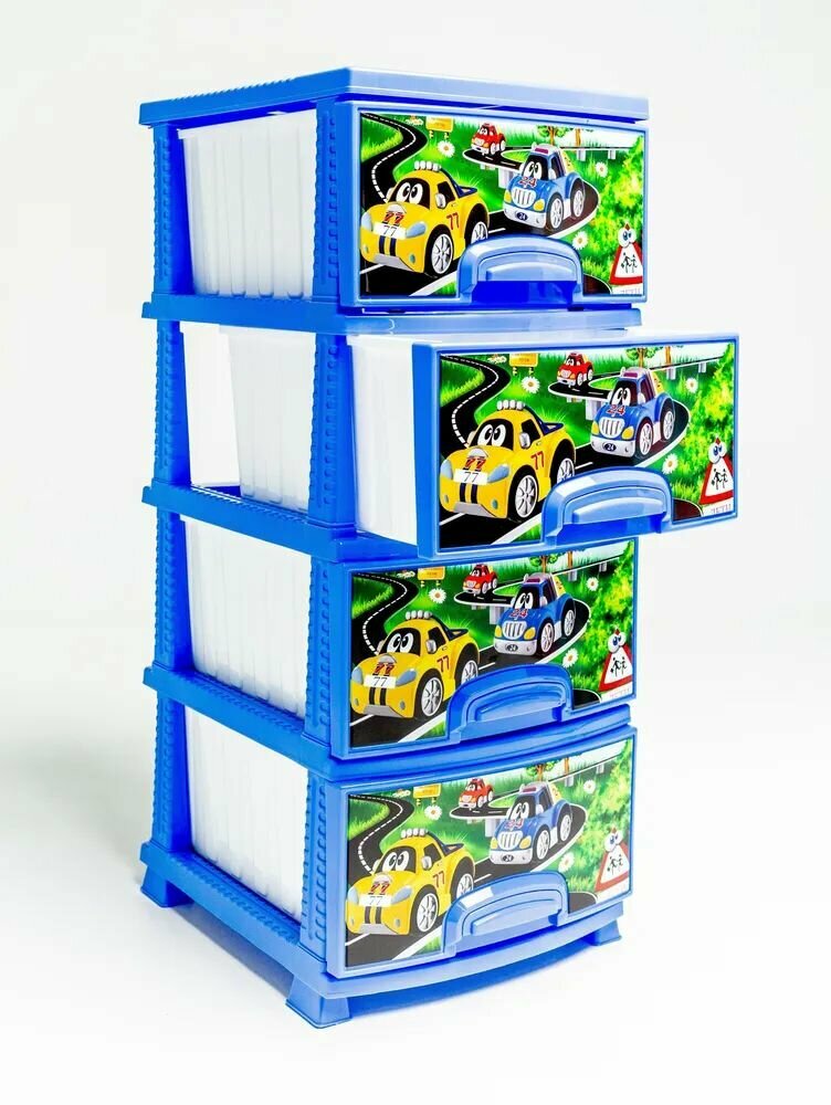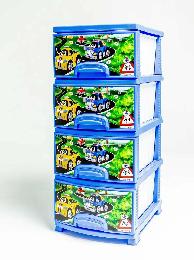 Купить Яркий комод детский комод "Машинки" (светло-голубой) 380*470*950 мм, 4 вместительных ящика