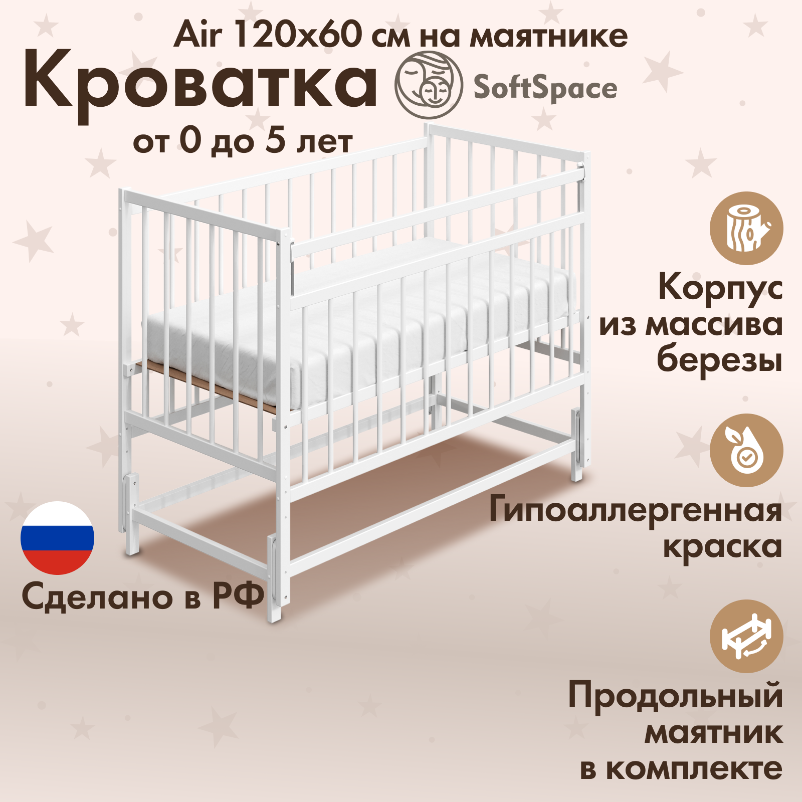 Детская кроватка для новорожденного SoftSpace Air прямоугольная, 120х60 см, Береза, цвет Белый, с маятником интересное: