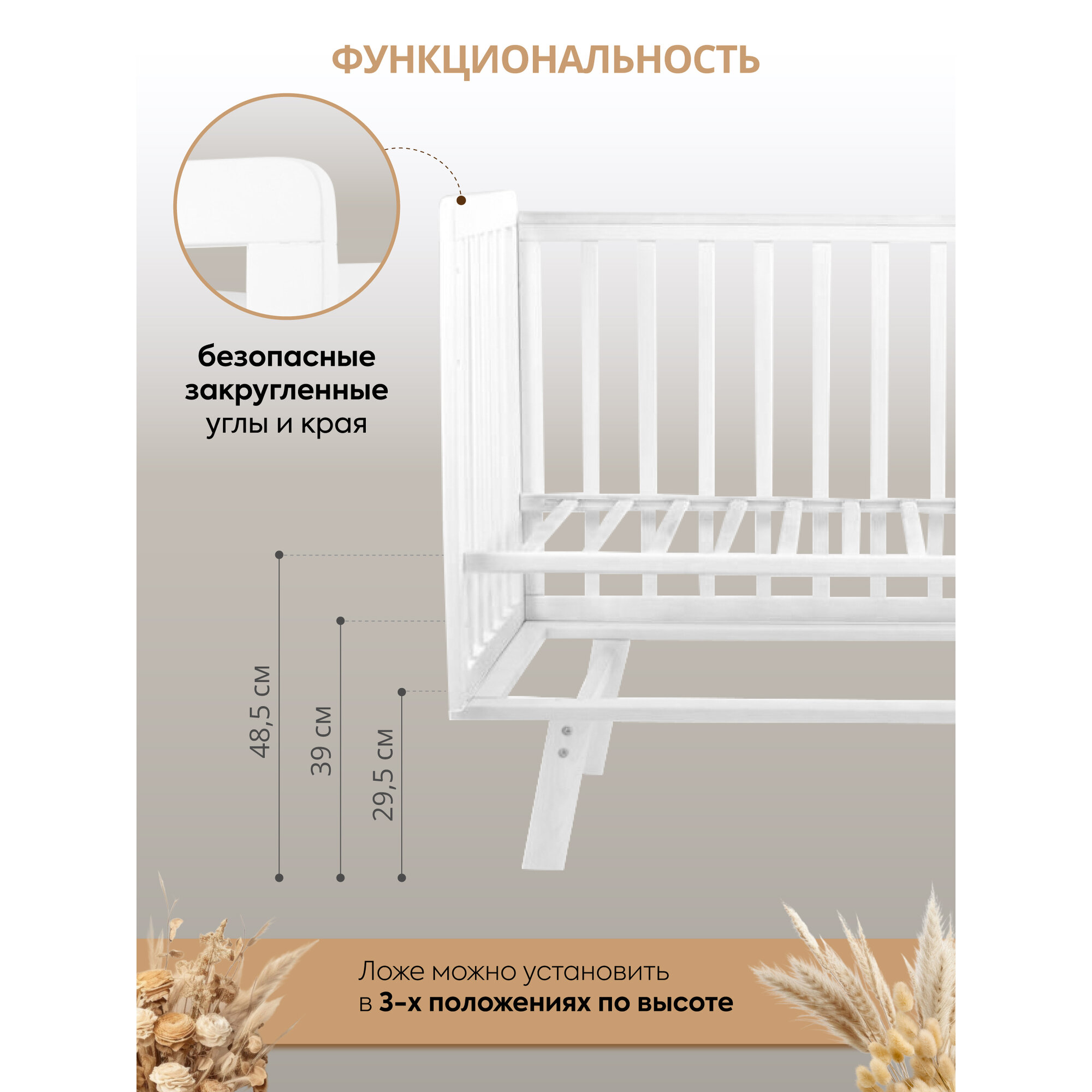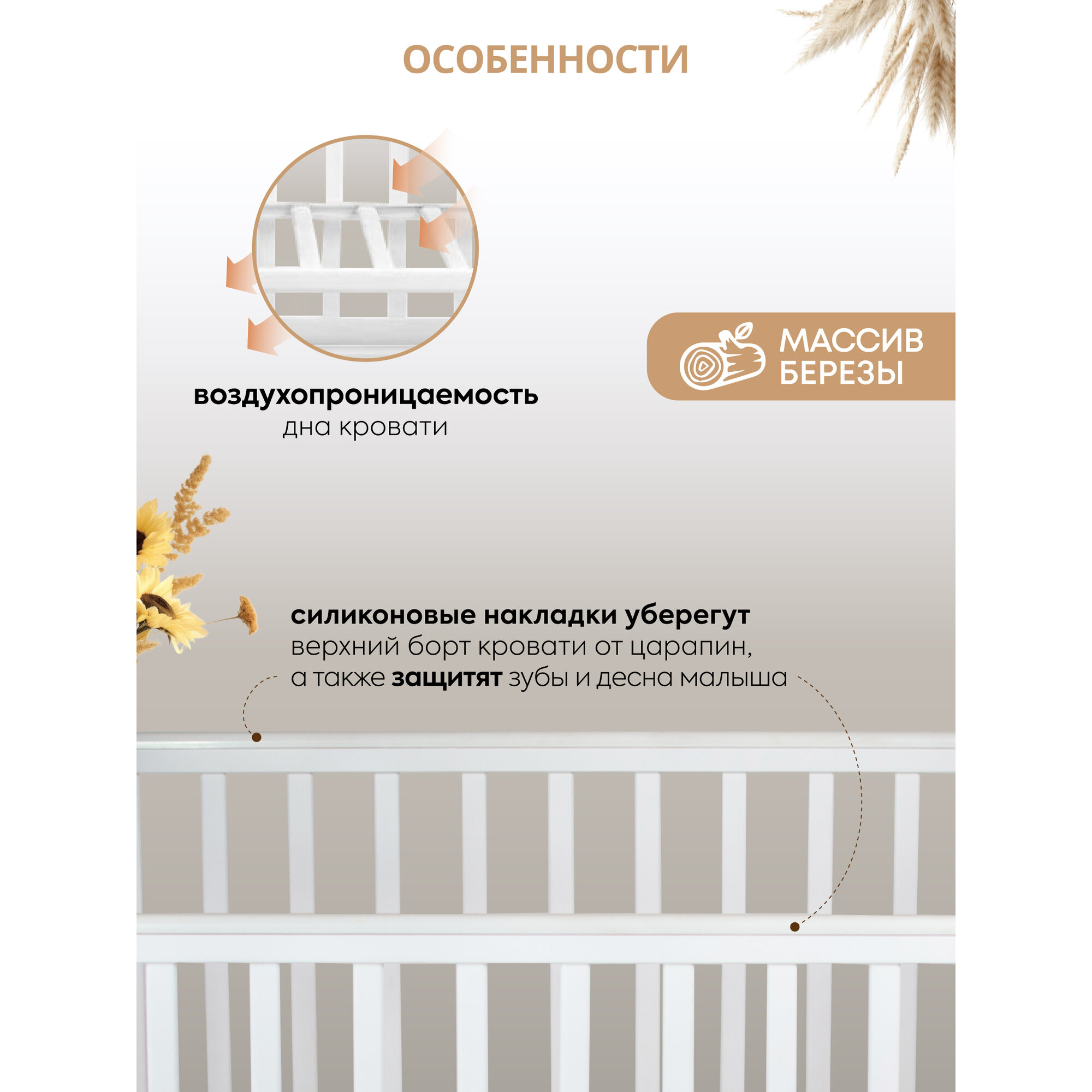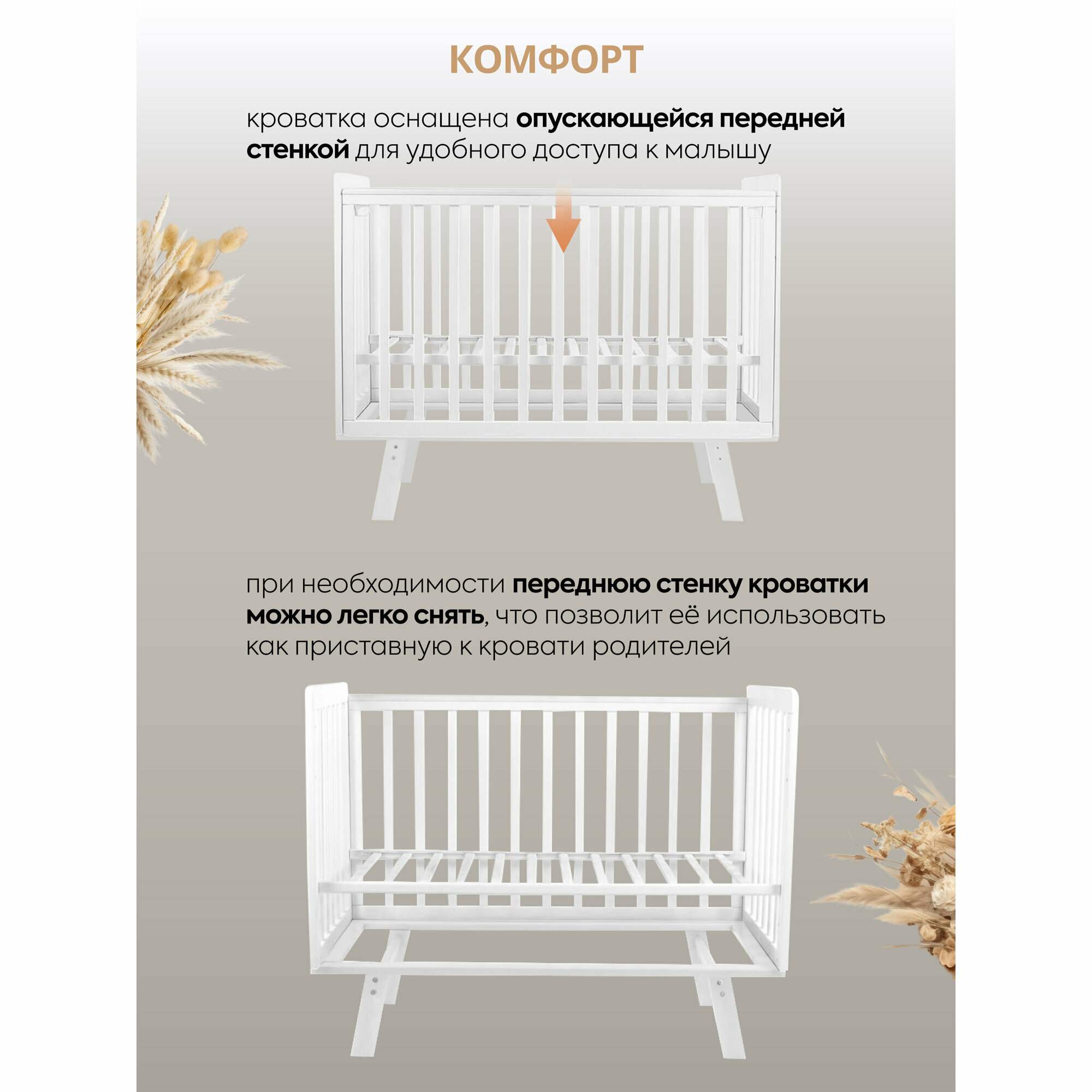 Кроватка детская Indigo Style IN-01 для новорожденных, легкосъемная стенка, ножки, массив березы, белый, белый интересное: