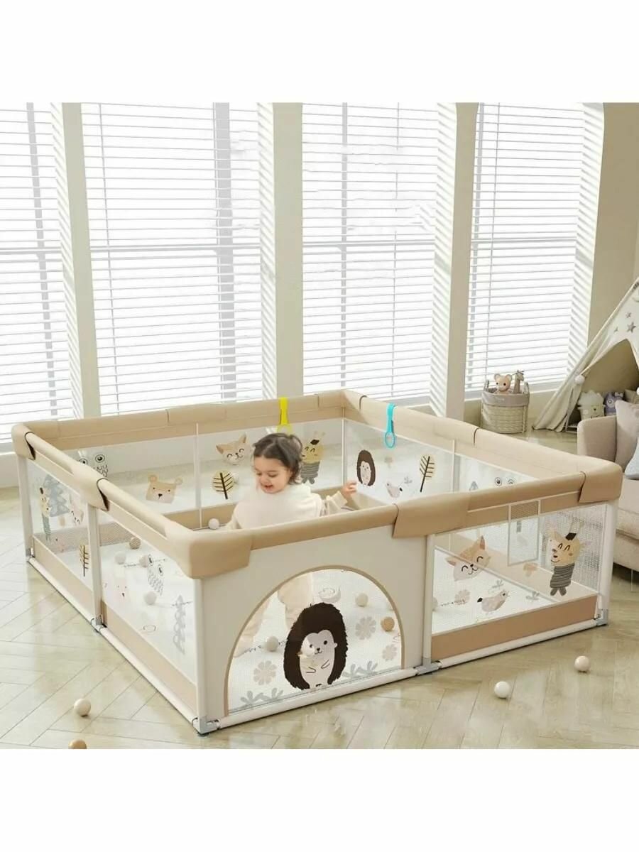 Купить Манеж детский игровой, напольный, бежевый (ежик), металлический каркас, с ручками и шариками, 180х150 см