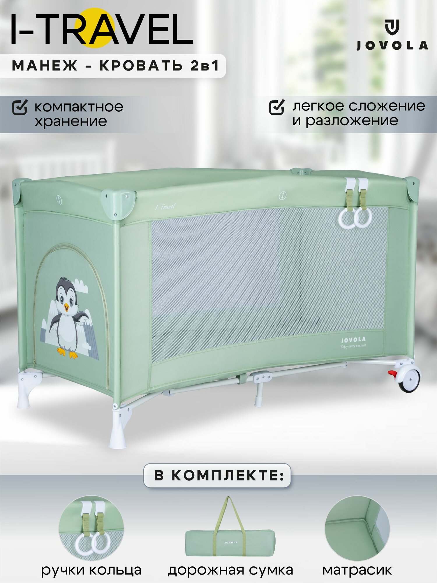 Манеж кровать детский Jovola I-Travel BP01P для новорожденных, 0-36 месяцев, с матрасом, 1 уровень, зеленый интересное: